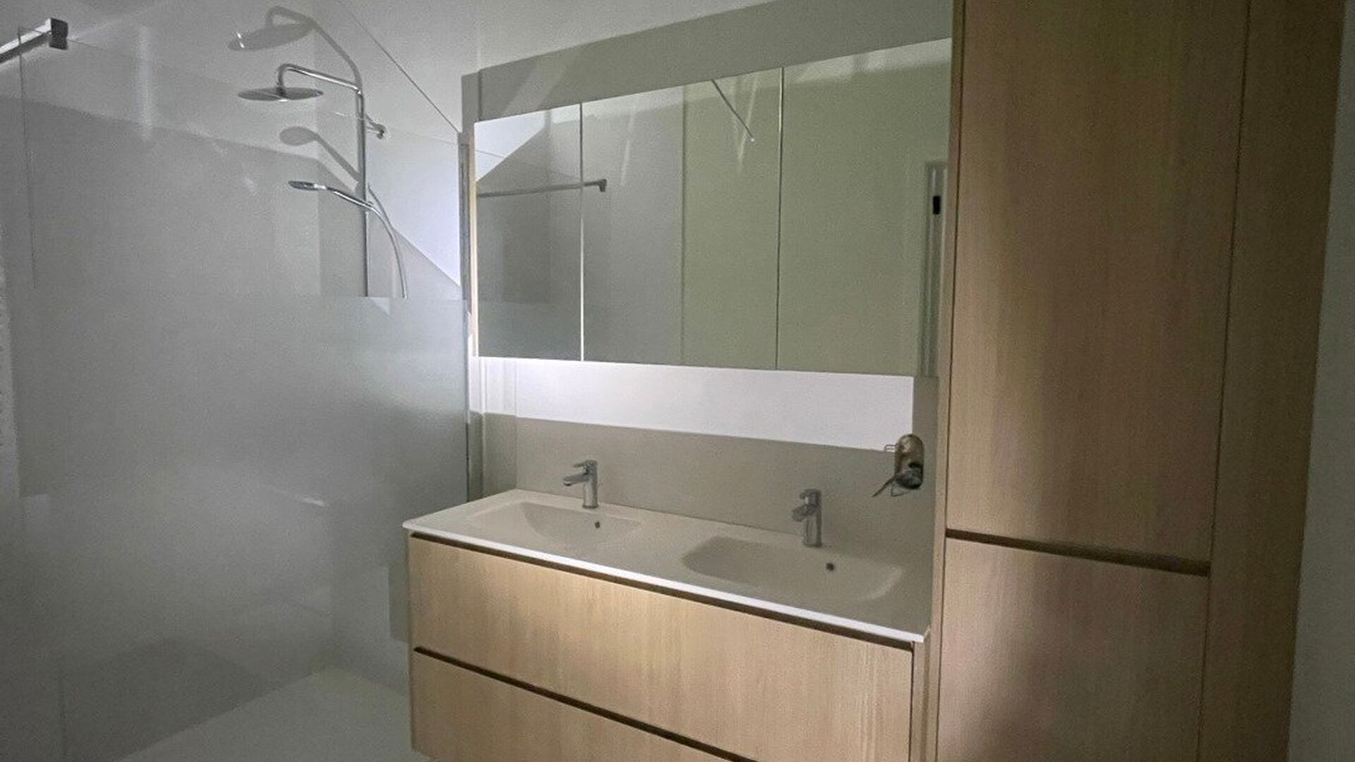Naast de keuken bevindt zich een praktische berging met aansluiting voor een wasmachine en een handige spoelbak. Verder beschikt het appartement over twee comfortabele slaapkamers en een moderne badkamer met dubbele wastafel en inloopdouche.