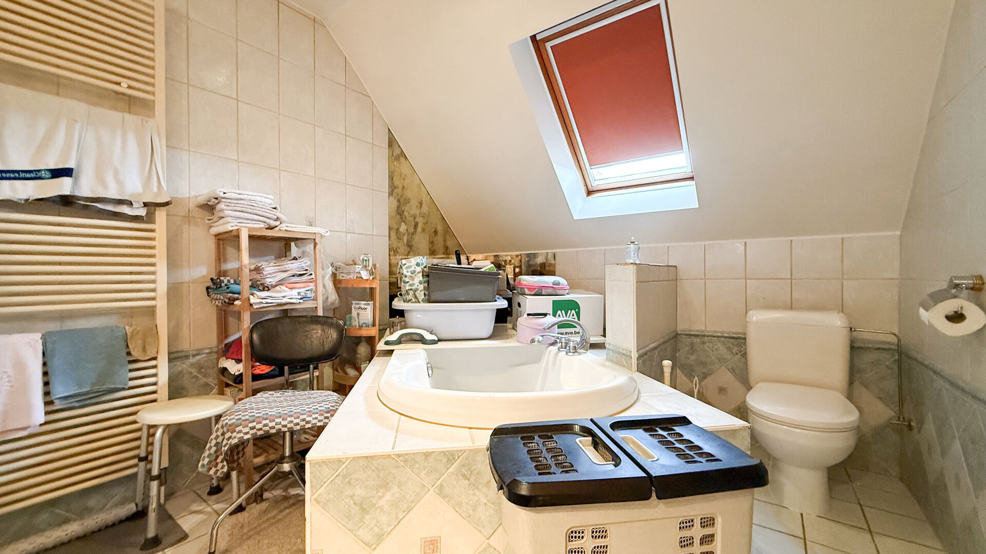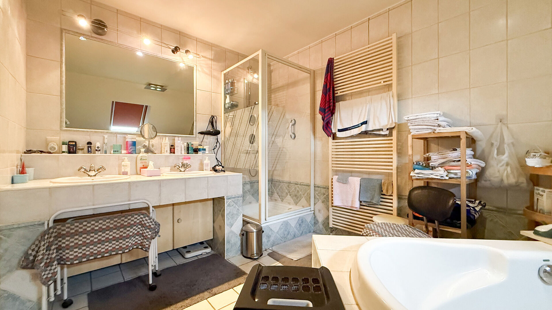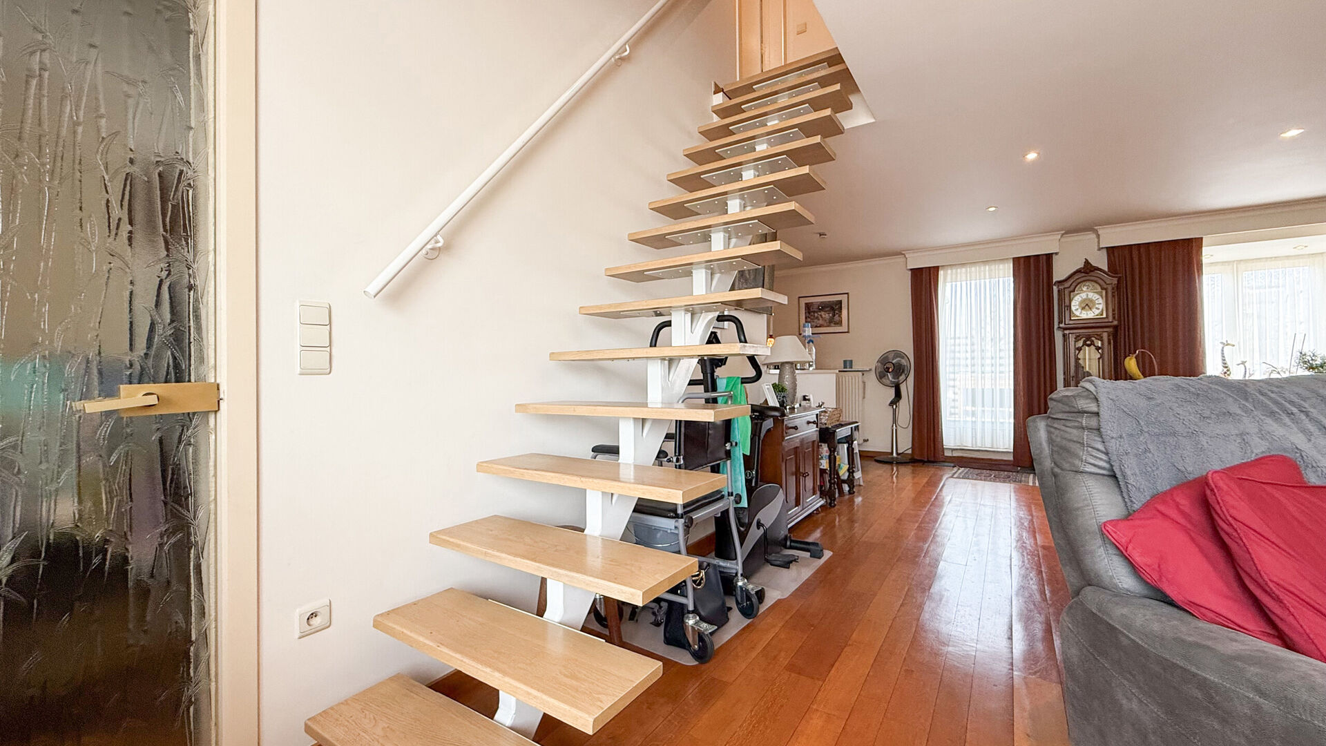 De stijlvolle open trap leidt u naar de bovenverdieping, waar airconditioning voor aangenaam comfort zorgt. De badkamer is luxueus uitgerust met een ligbad, aparte douche, tweede toilet, en een elegante dubbele lavabo — pure verwennerij.