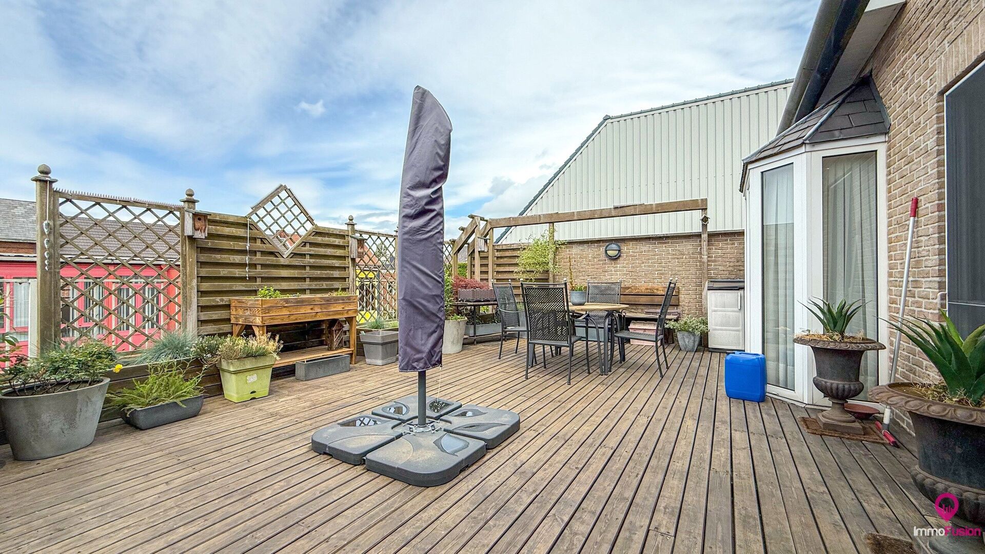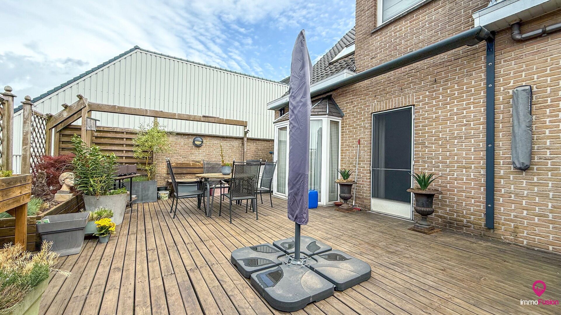 - Groot, omheind houten terras met elektrische luifel en bloembakken