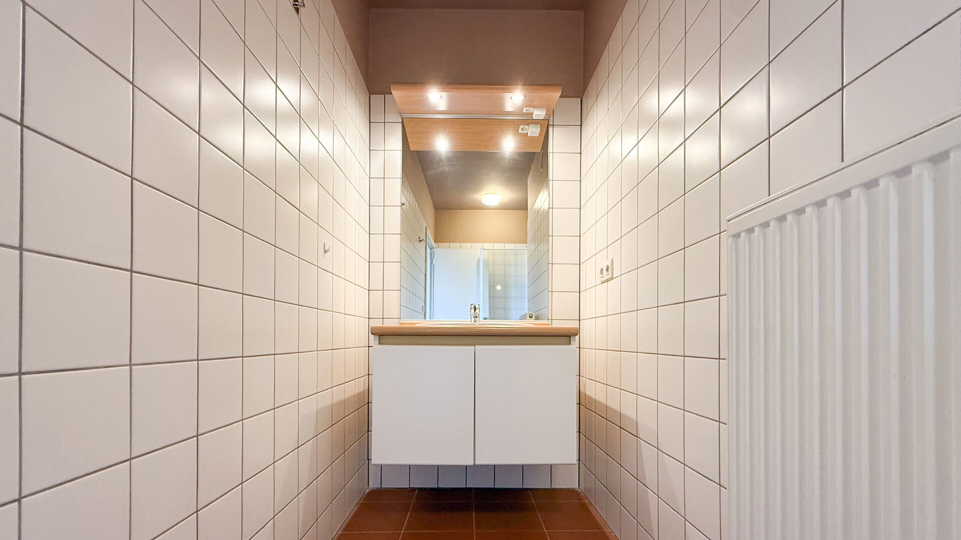 Via de woonkamer leidt een deur naar het ruime, inpandige terras, ideaal voor ontspanning in de buitenlucht. Terug via de gang bereiken we de gezellige badkamer met een douche en lavabomeubel. Het biedt een ruime slaapkamers en de mogelijkheid tot uitbreiding van de zolderruimte naar een 2e slaapkamer, ideaal voor een koppel of klein gezin.