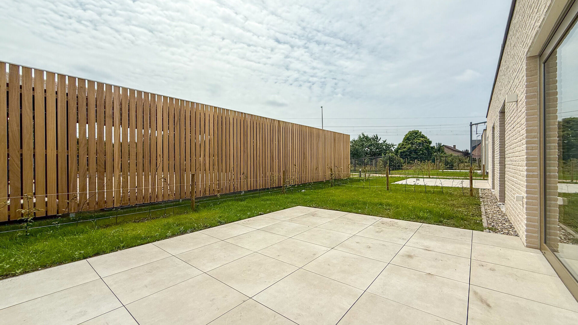 Het appartement heeft een ruim terras en een privétuintje met een poortje met onmiddellijk toegang naar de fietsenstalling en autostandplaatsen.