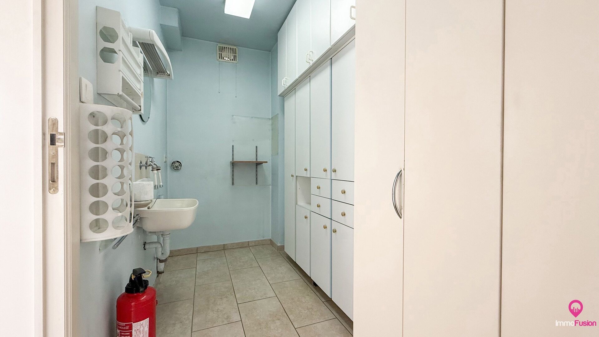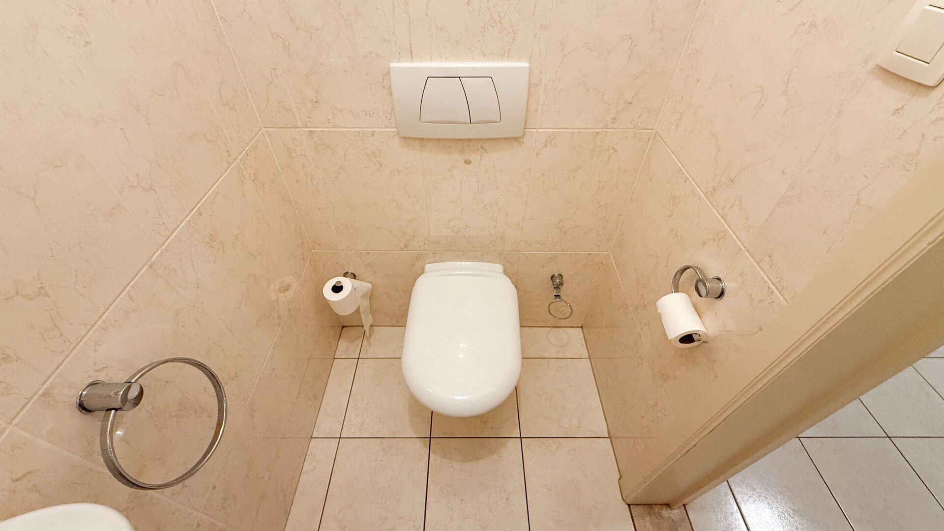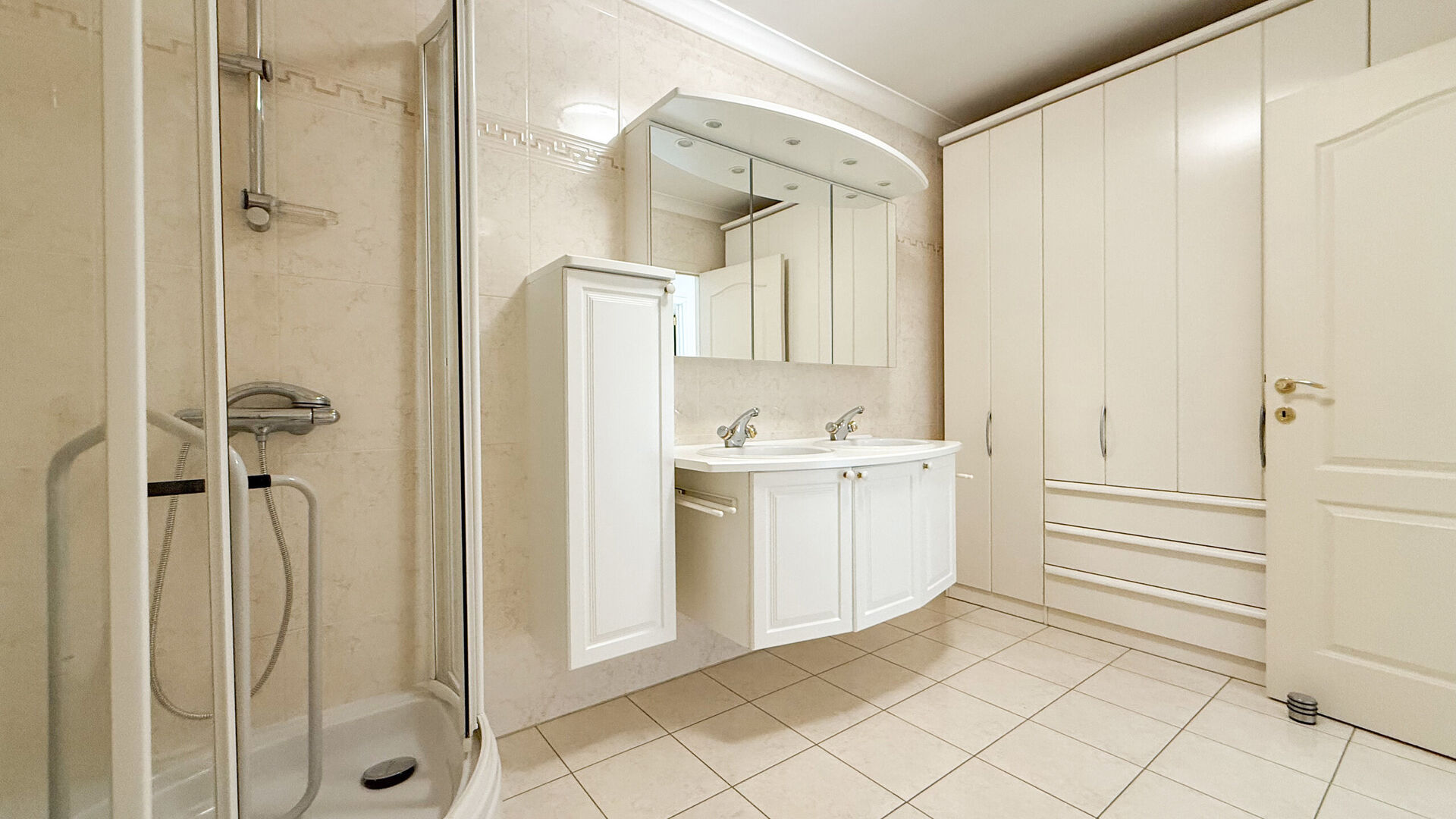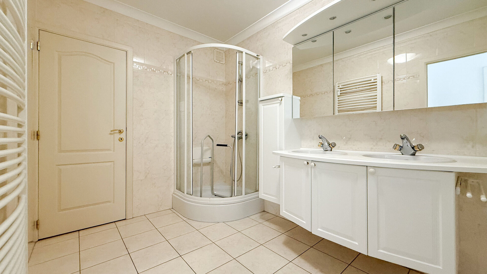 De ruime badkamer is uitgerust met een douche en dubbele lavabo. Daarnaast is er een apart toilet voorzien. Het appartement beschikt over 2 volwaardige slaapkamers, ideaal als master bedroom en logeer- of bureauruimte.