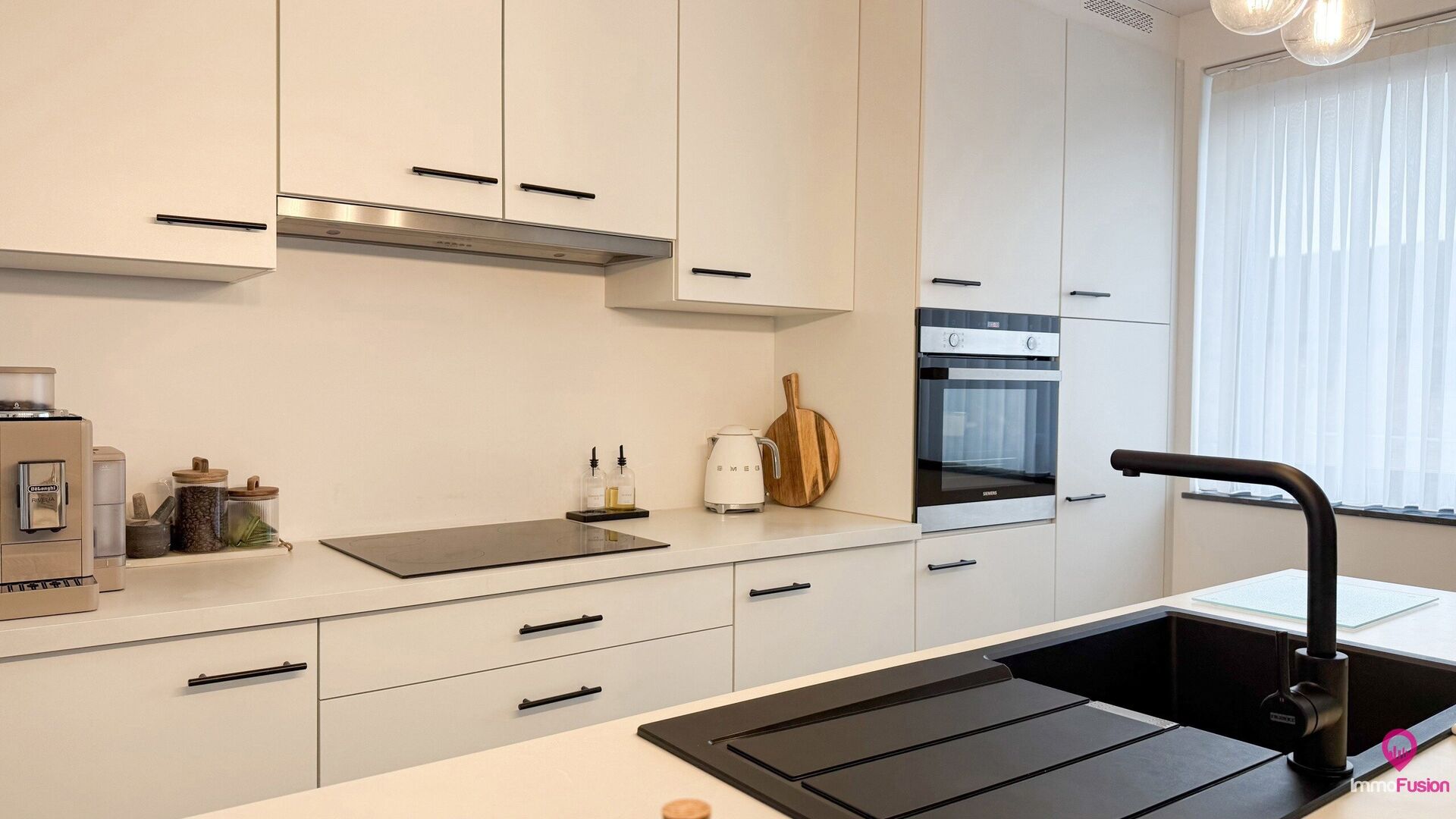 De volledig geïnstalleerde keuken met eiland is uitgerust met kwalitatieve toestellen, slimme opbergruimte en een stijlvol design dat perfect past in het open leefconcept.