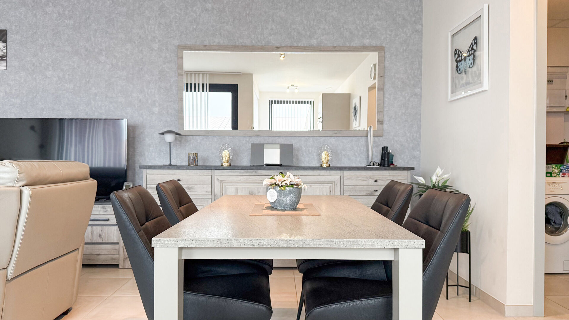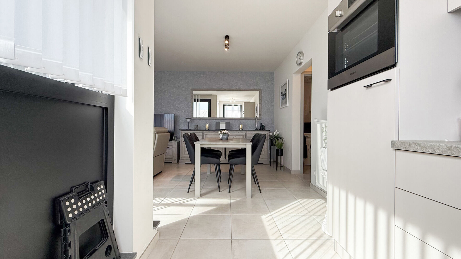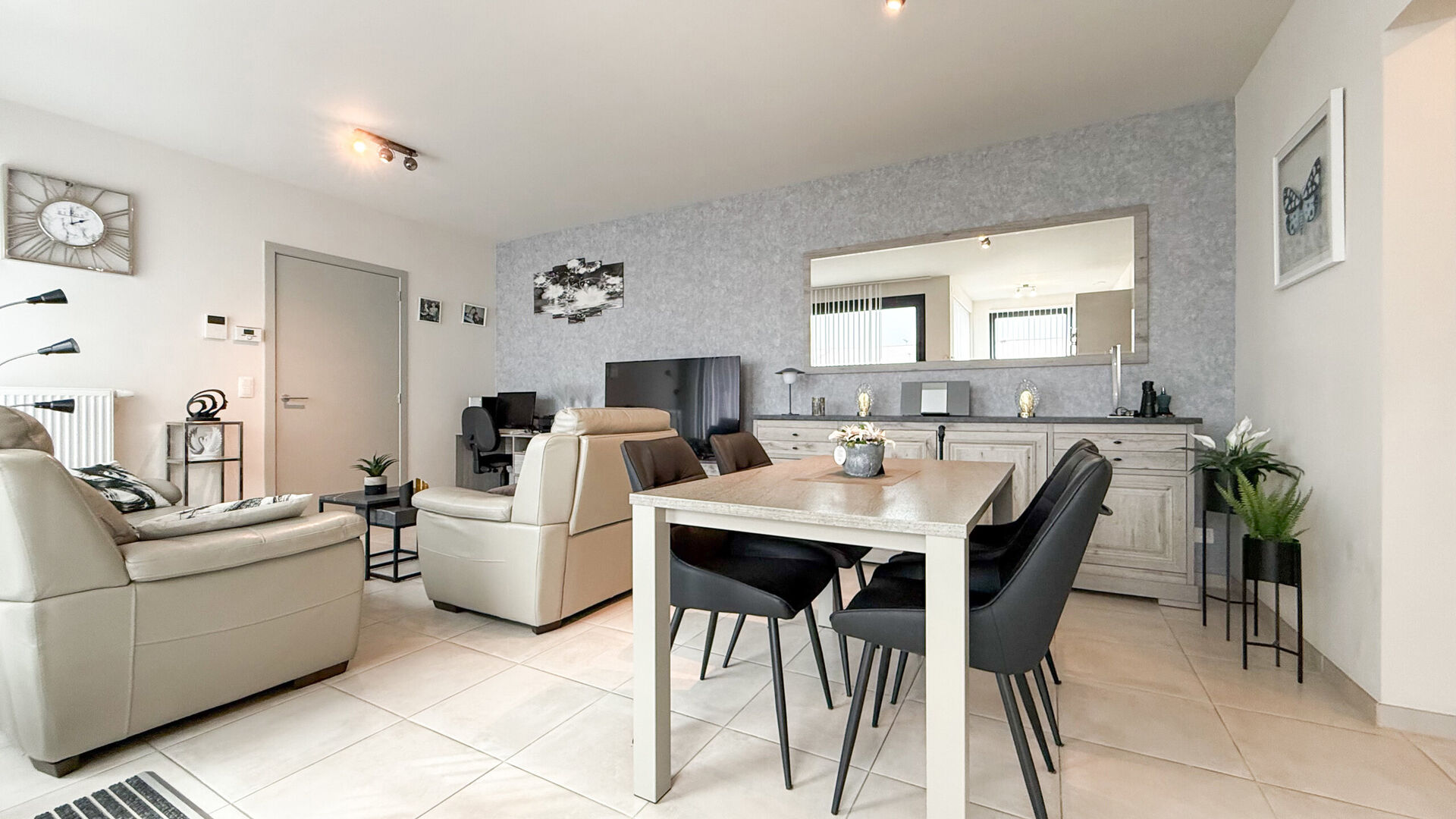 De leefruimte biedt voldoende plaats voor een gezellige zithoek en een ruime eettafel. Aansluitend vind je het terras van 10 m², een ideale plek om te ontspannen of te genieten van een kopje koffie in de buitenlucht.