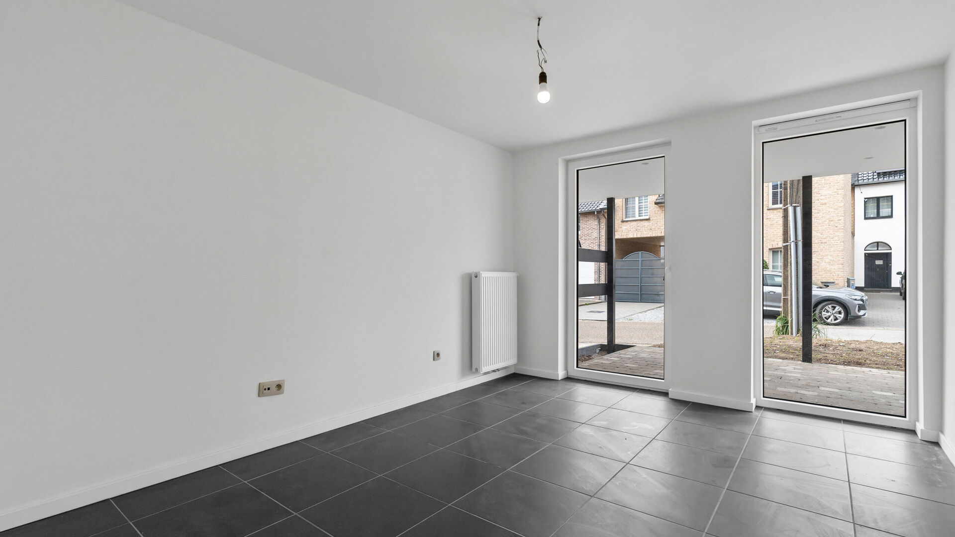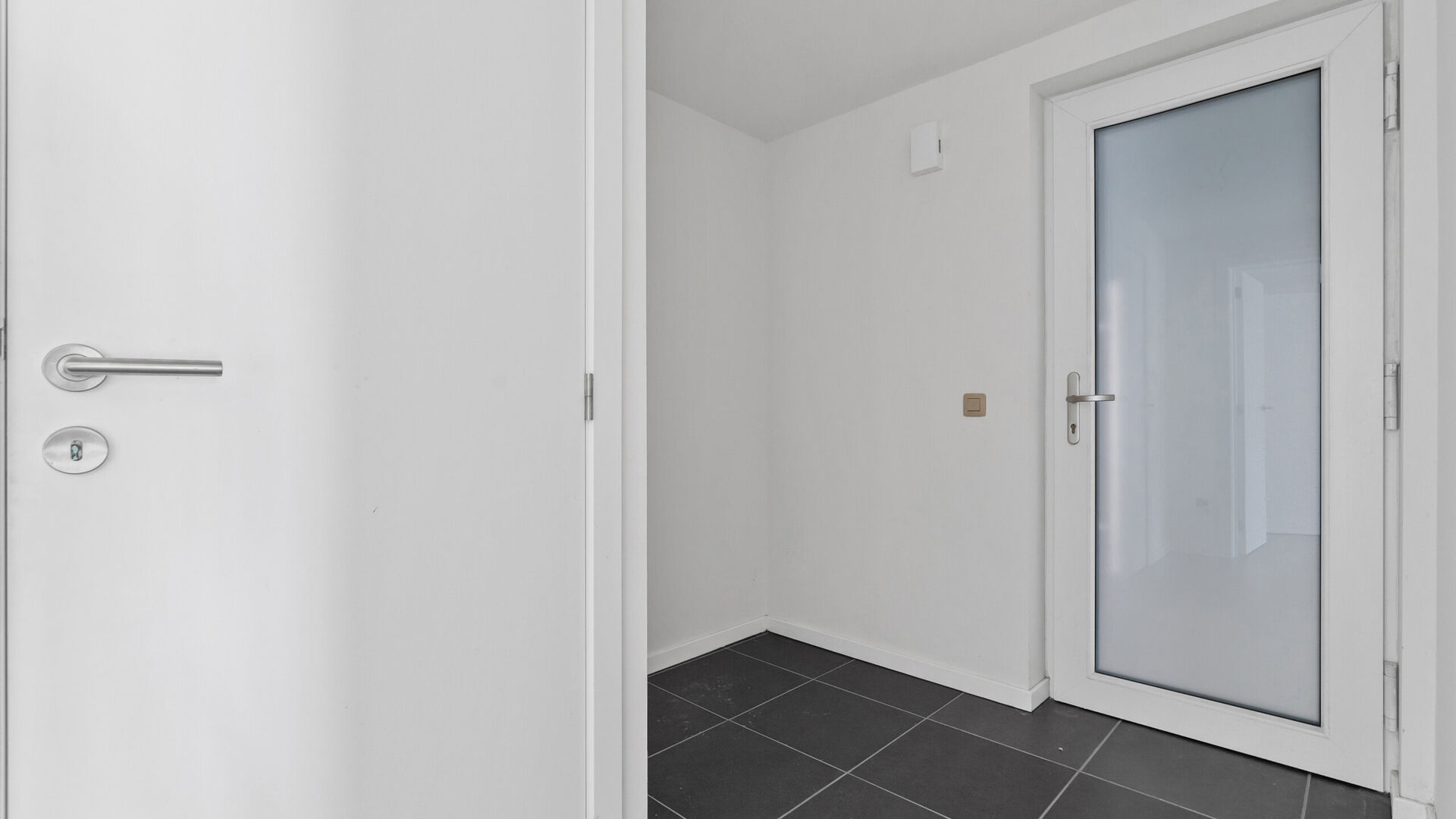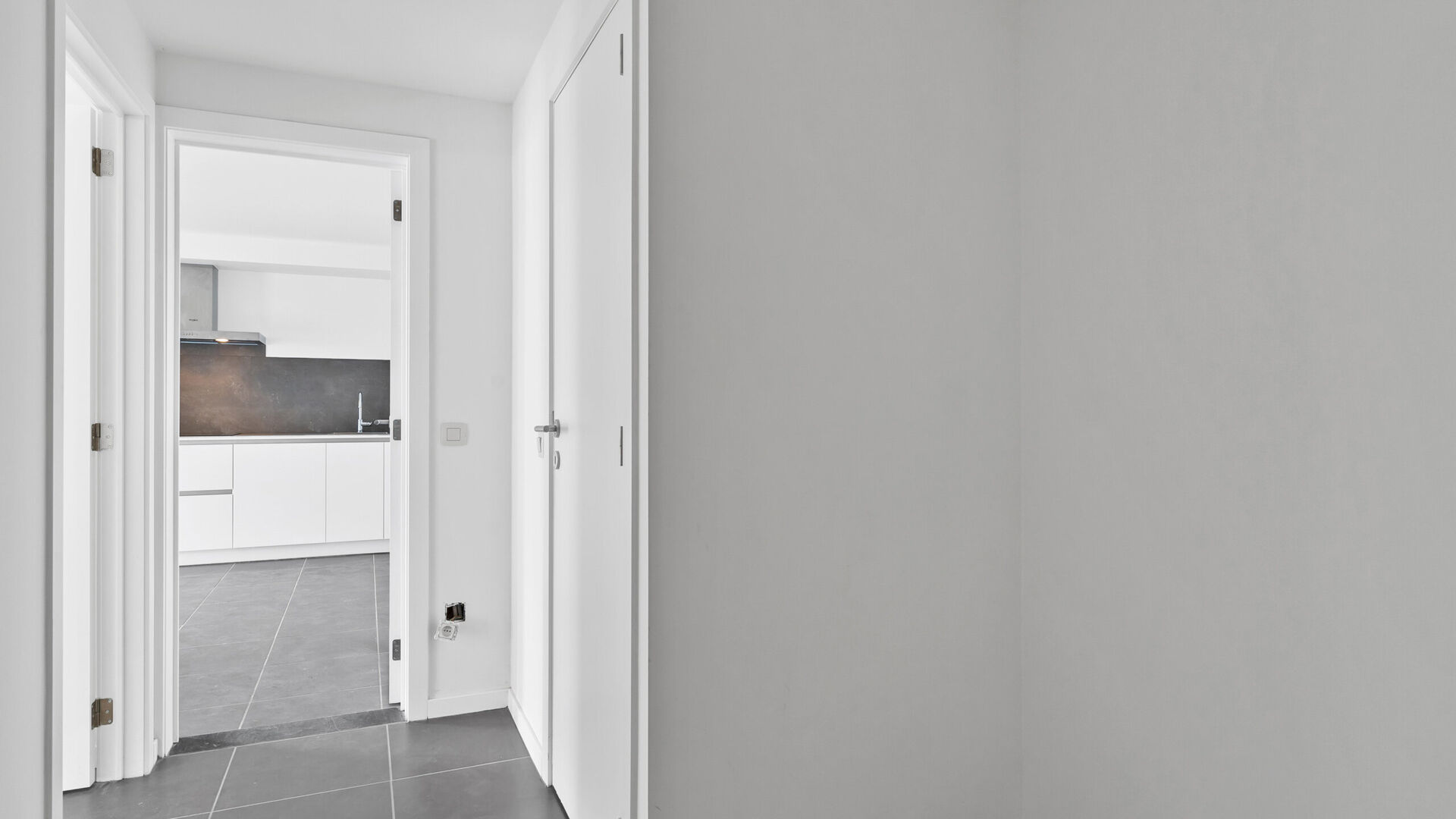 Bij binnenkomst word je verwelkomd door een ruime inkomhal met gastentoilet. Aan de linkerzijde bevindt zich de slaapkamer, voorzien van een groot draai-/kiepraam dat uitkijkt op het terras en de tuin. De lichte grijze tegelvloer, die door het volledige appartement doorloopt, zorgt voor een moderne, uniforme uitstraling en is bovendien onderhoudsvriendelijk.