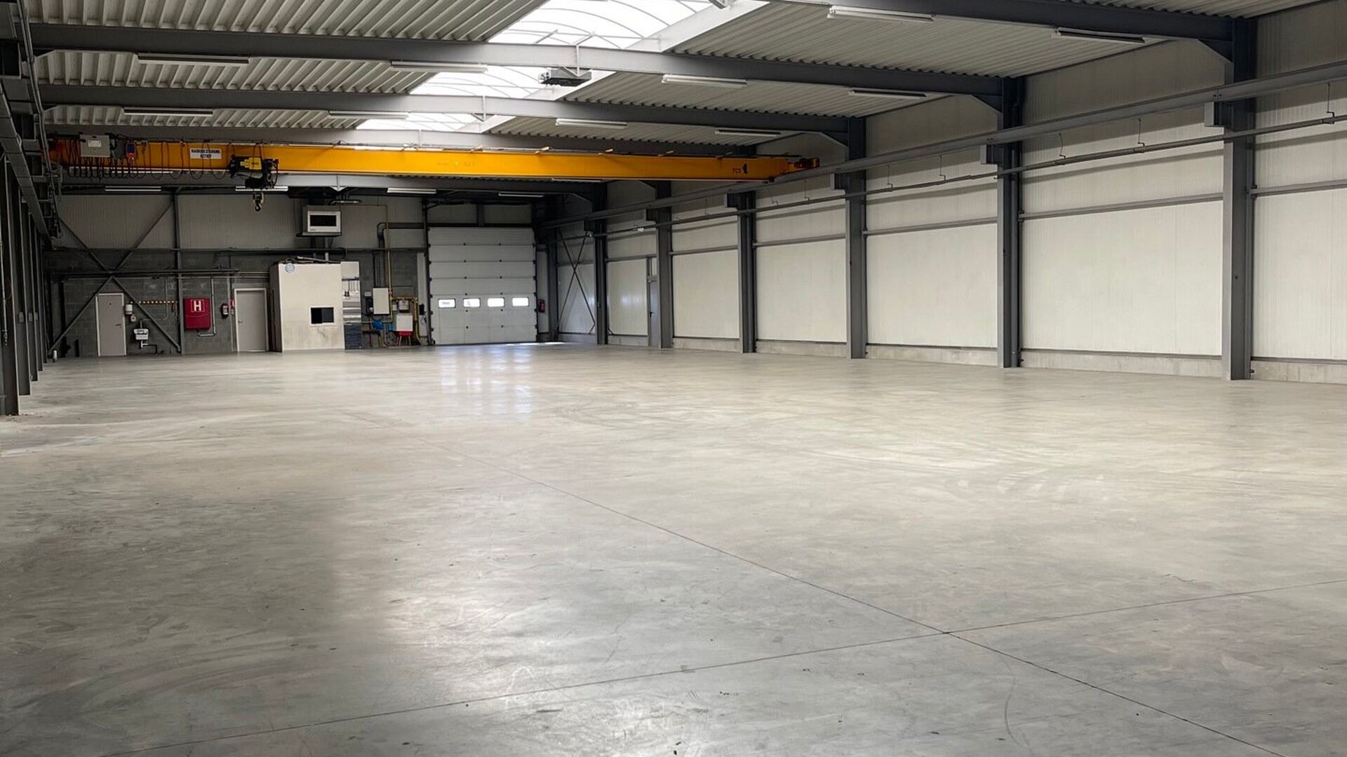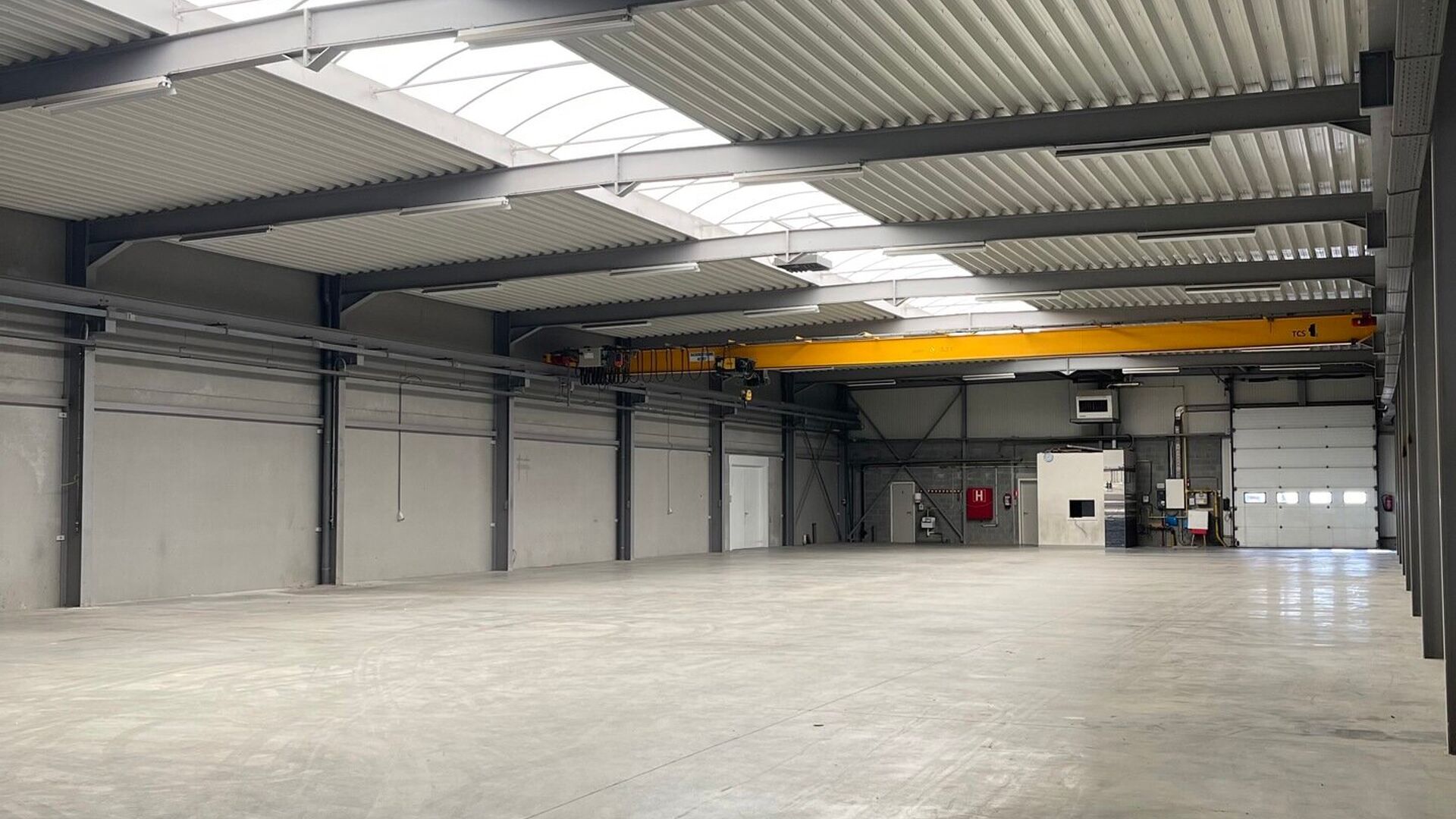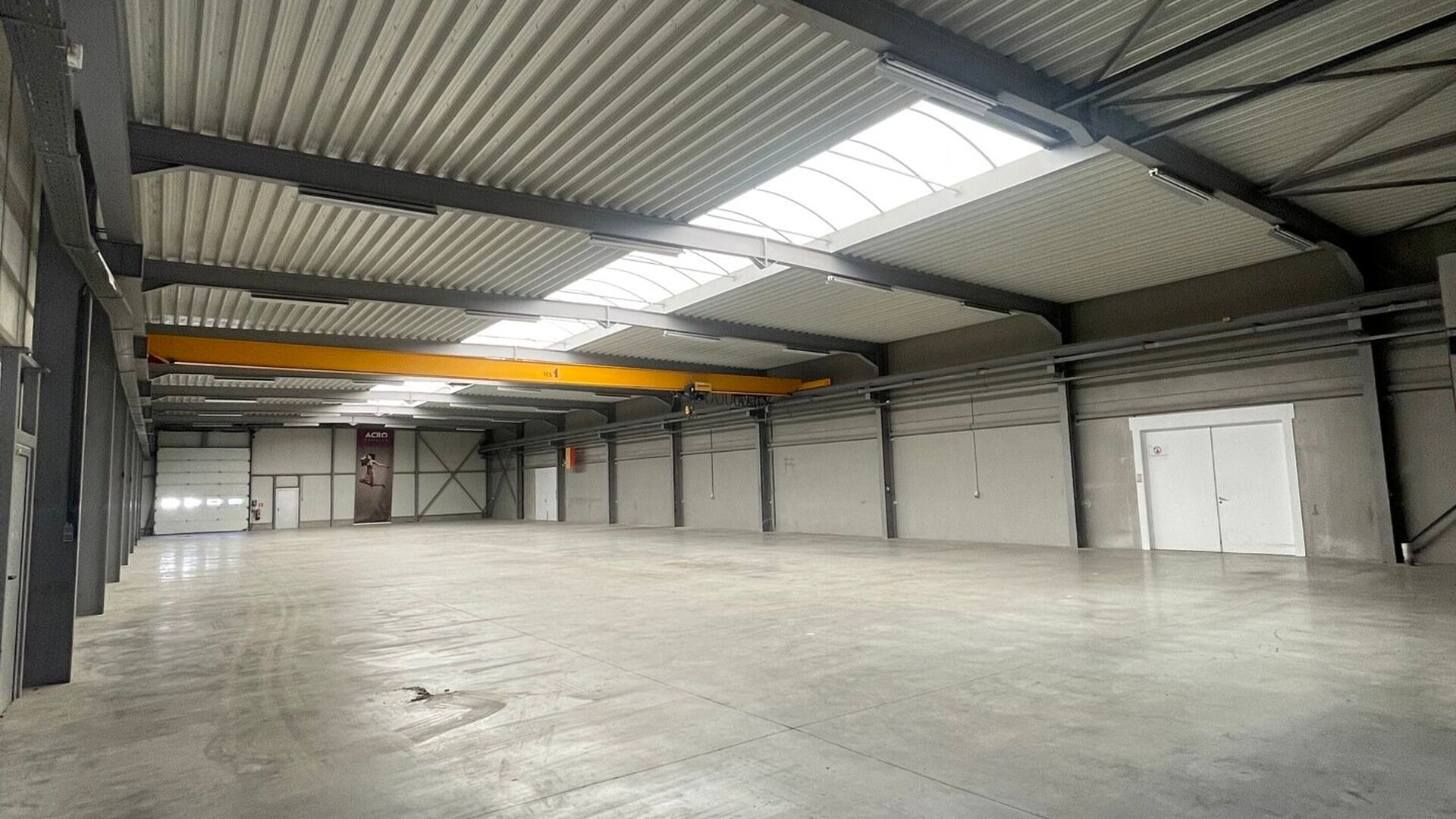 Het gebouw bestaat uit een productiehal/magazijn van 900 m² en een gelijkvloerse kantoor- en toonzaalruimte van 100 m². De hal is functioneel uitgerust en geniet van natuurlijke lichtinval dankzij een lichtstraat. Voor een vlotte logistieke werking zijn er twee sectionaalpoorten aanwezig, evenals een rolbrug met een capaciteit van 3,2 ton en een geïntegreerde persluchtinstallatie.