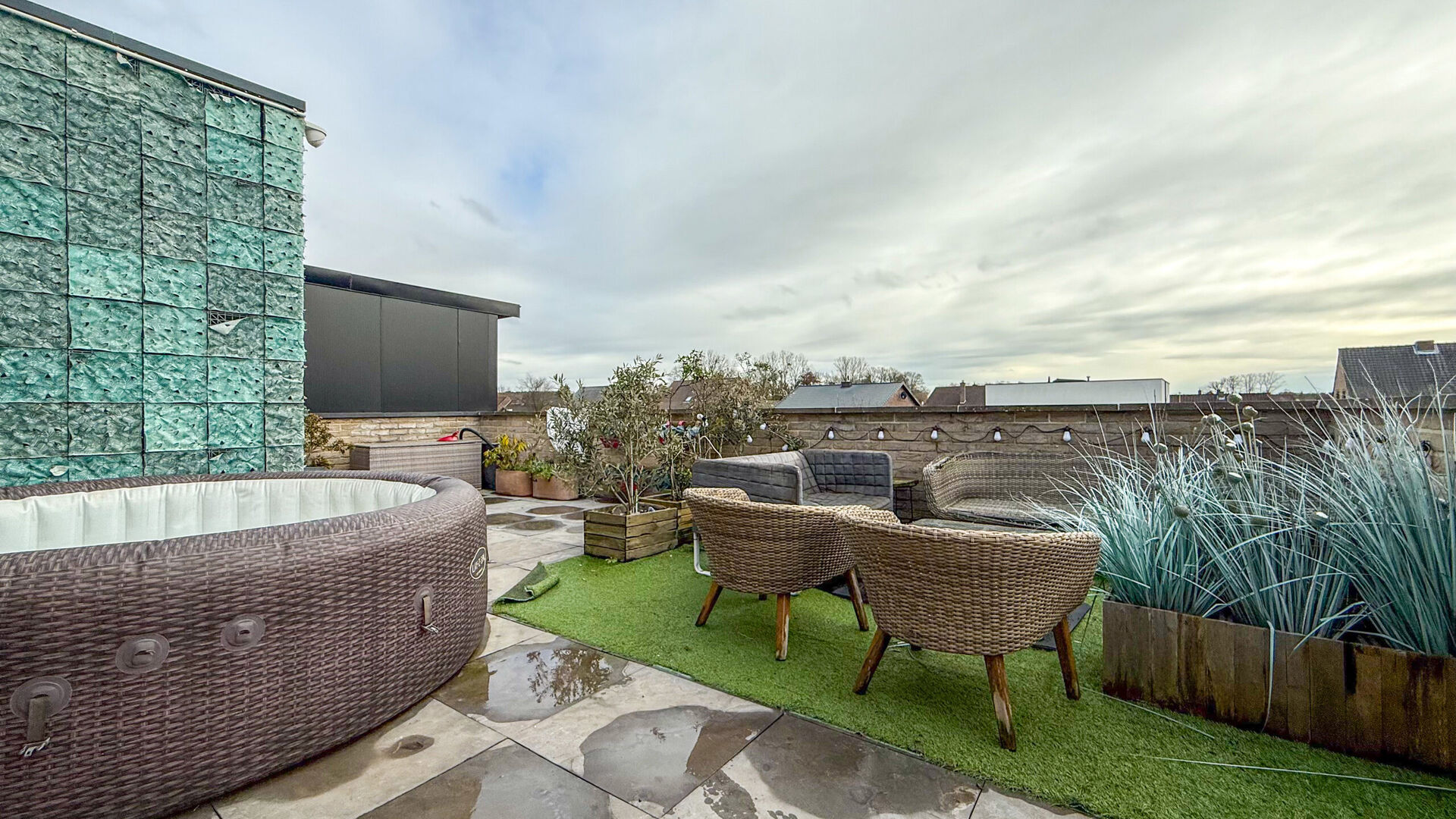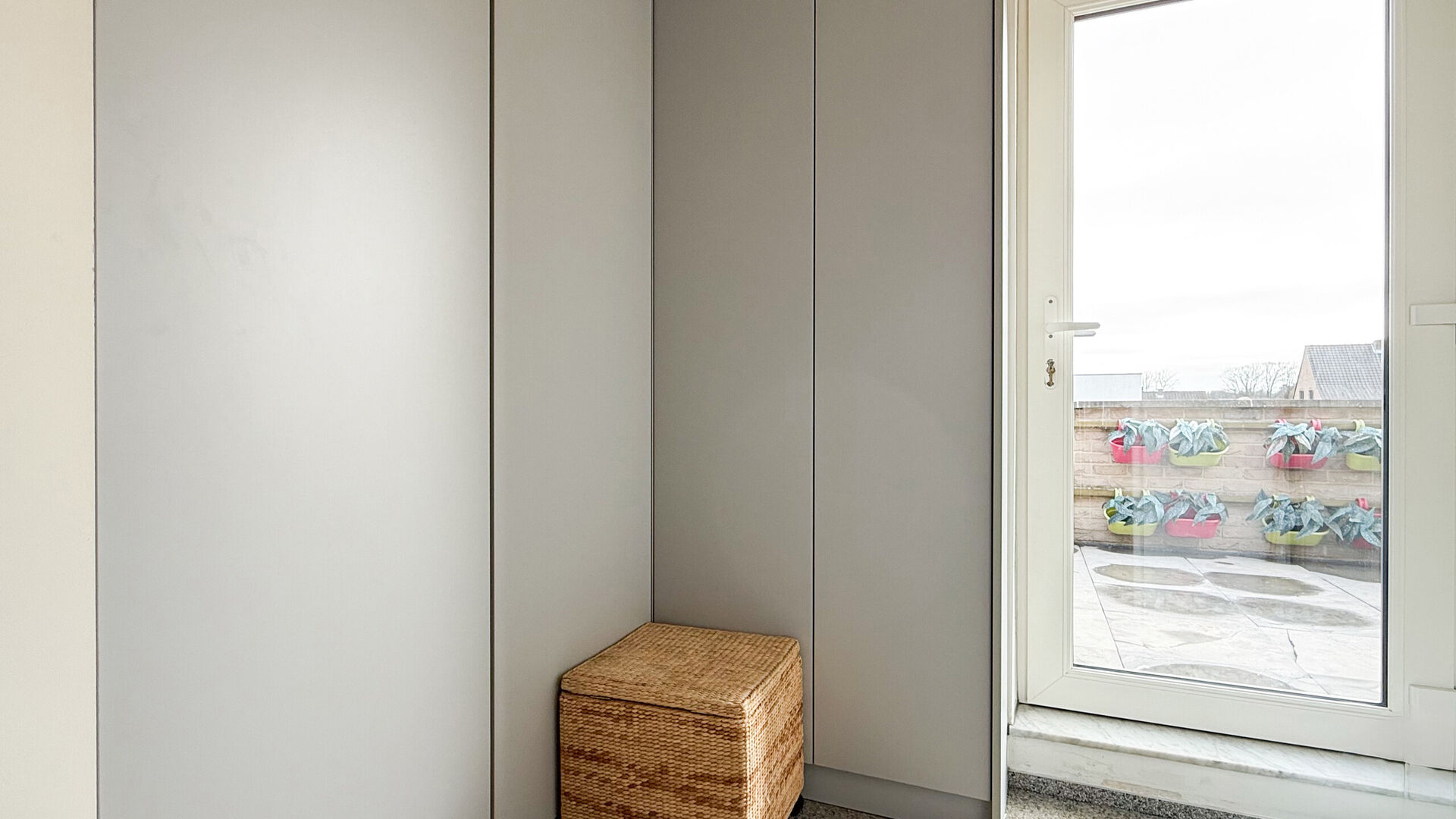 Links van de inkom bevindt zich het waskot en een praktische berging, met ruimte voor de inloopdouche. Vanuit deze ruimte is er eveneens toegang tot het terras. Via de grote schuifdeur in de woonkamer bereikt u het ruime zonneterras van maar liefst ca. 40 m², perfect om te ontspannen of gasten te ontvangen.