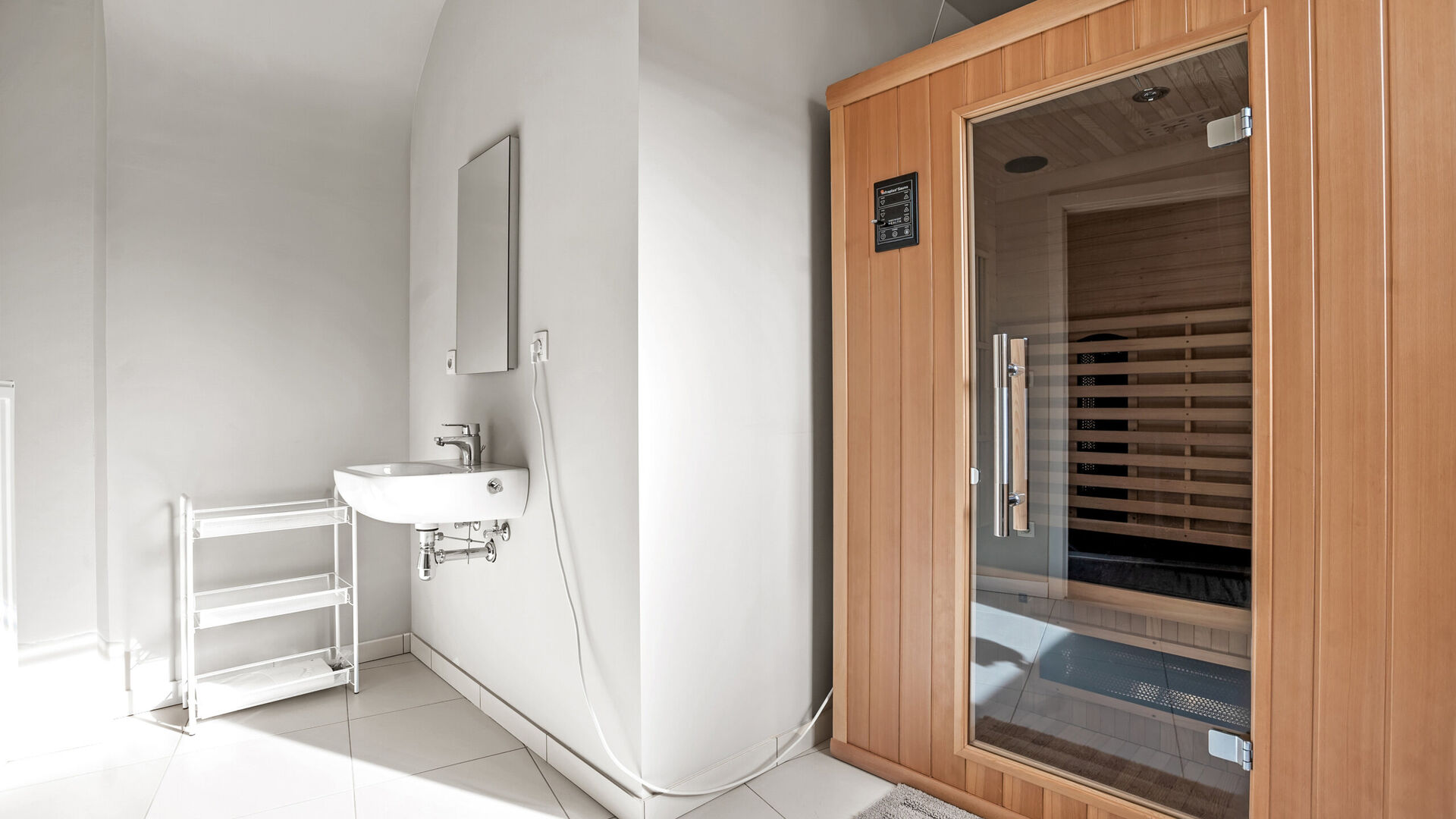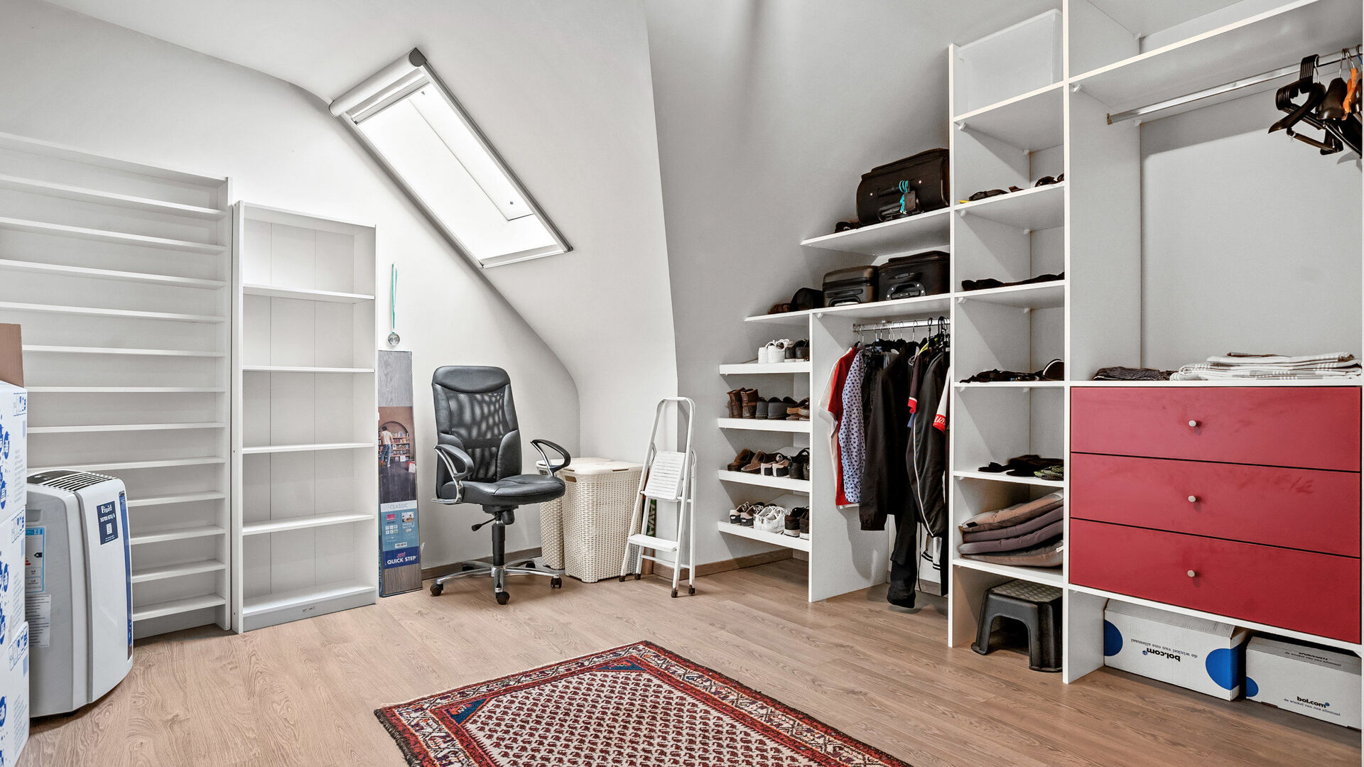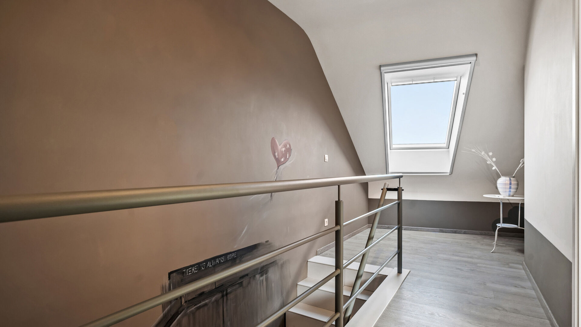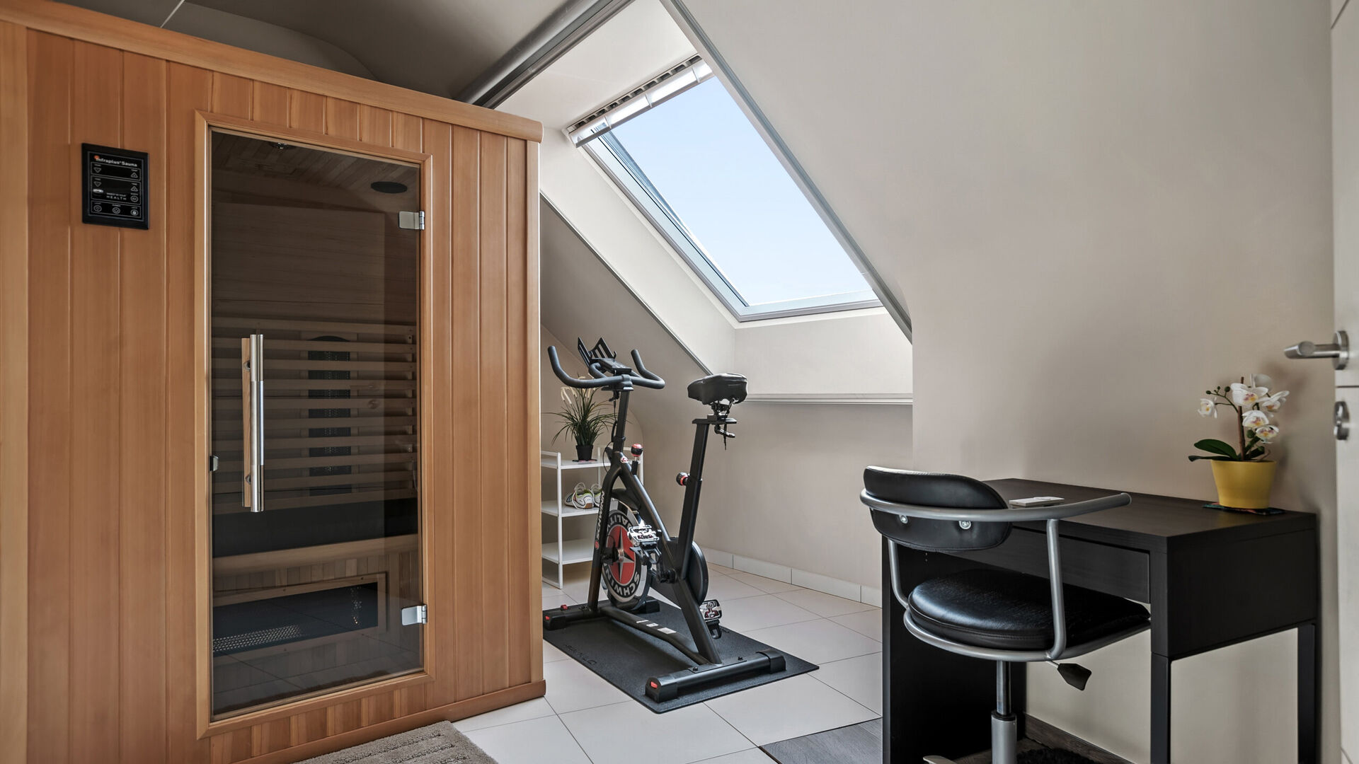 Op de derde verdieping geeft de nachthal toegang tot drie bijkomende kamers. De master bedroom is afgewerkt met een laminaatvloer en heeft een aansluitende ruimte waarin een ingebouwde sauna is voorzien – ideaal voor wie houdt van ontspanning en wellness in eigen huis. De overige kamers zijn momenteel ingericht als dressing en logeerkamer.