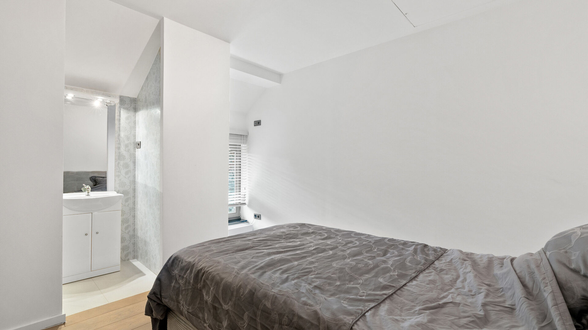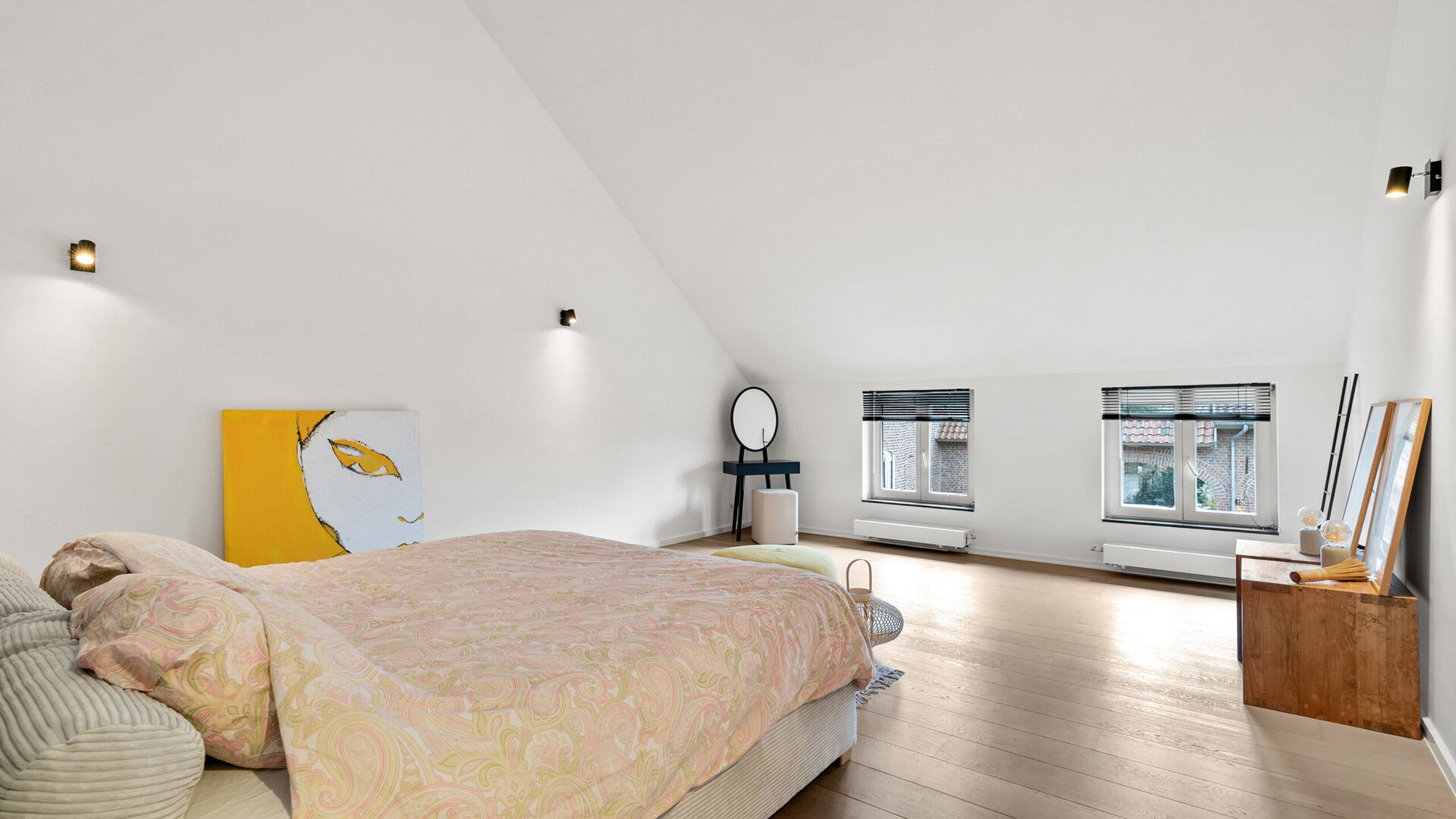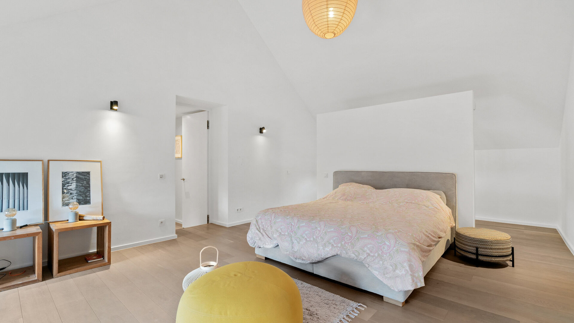 - Slaapkamer 4: zeer ruime kamer, deels onder het dak, meteigen inloopkast, bed, nachttafels en extra kasten