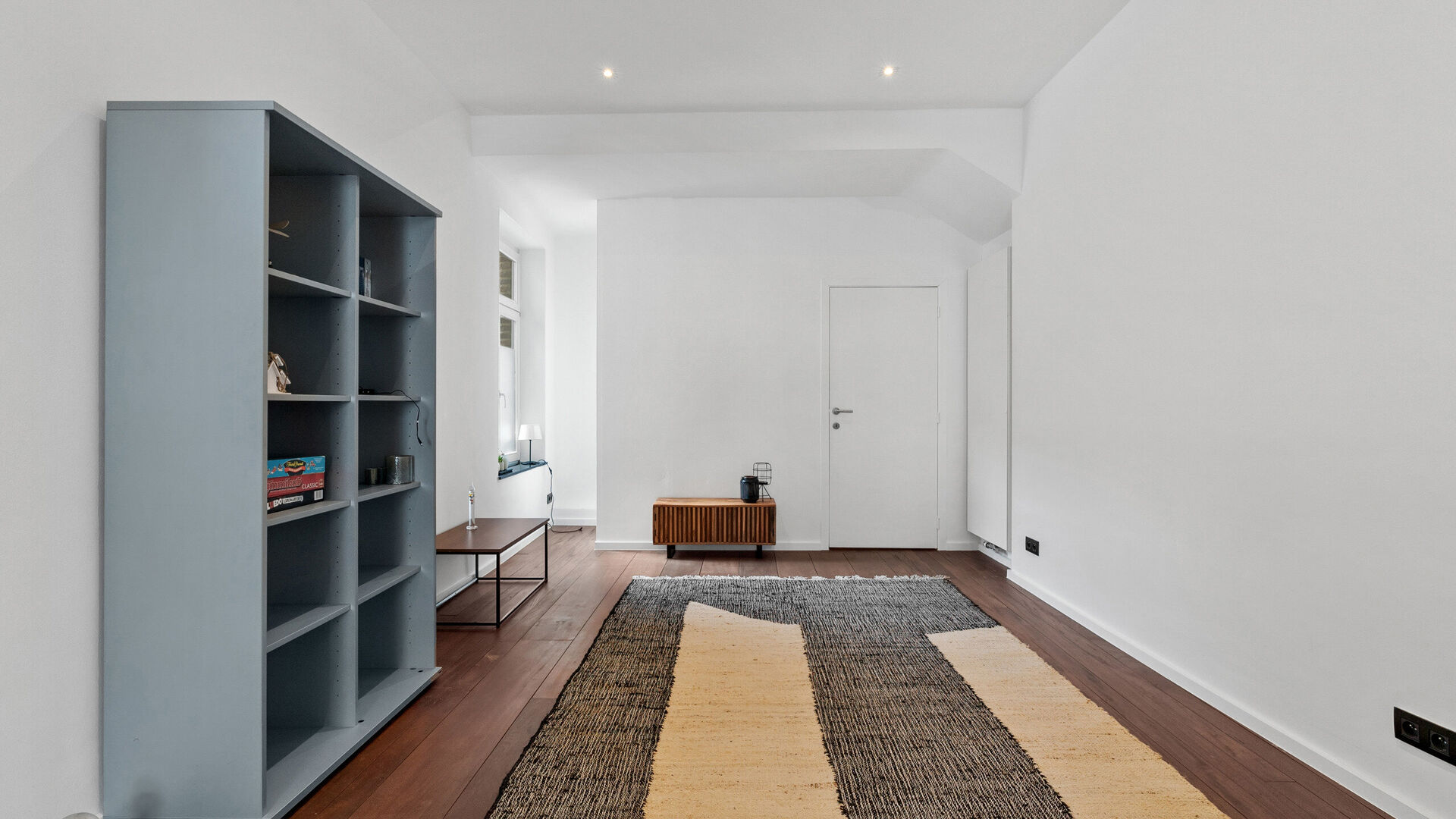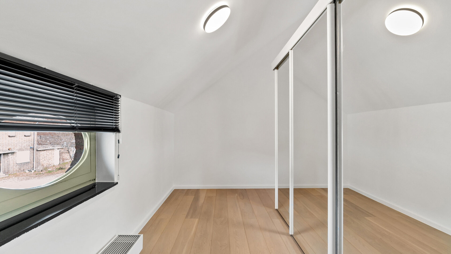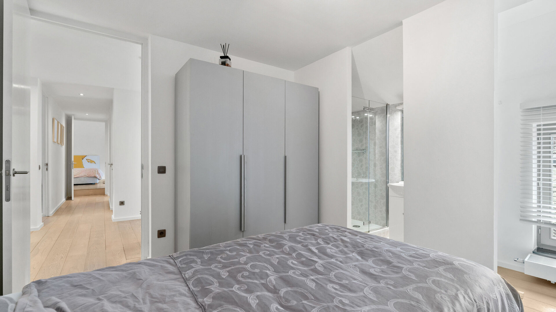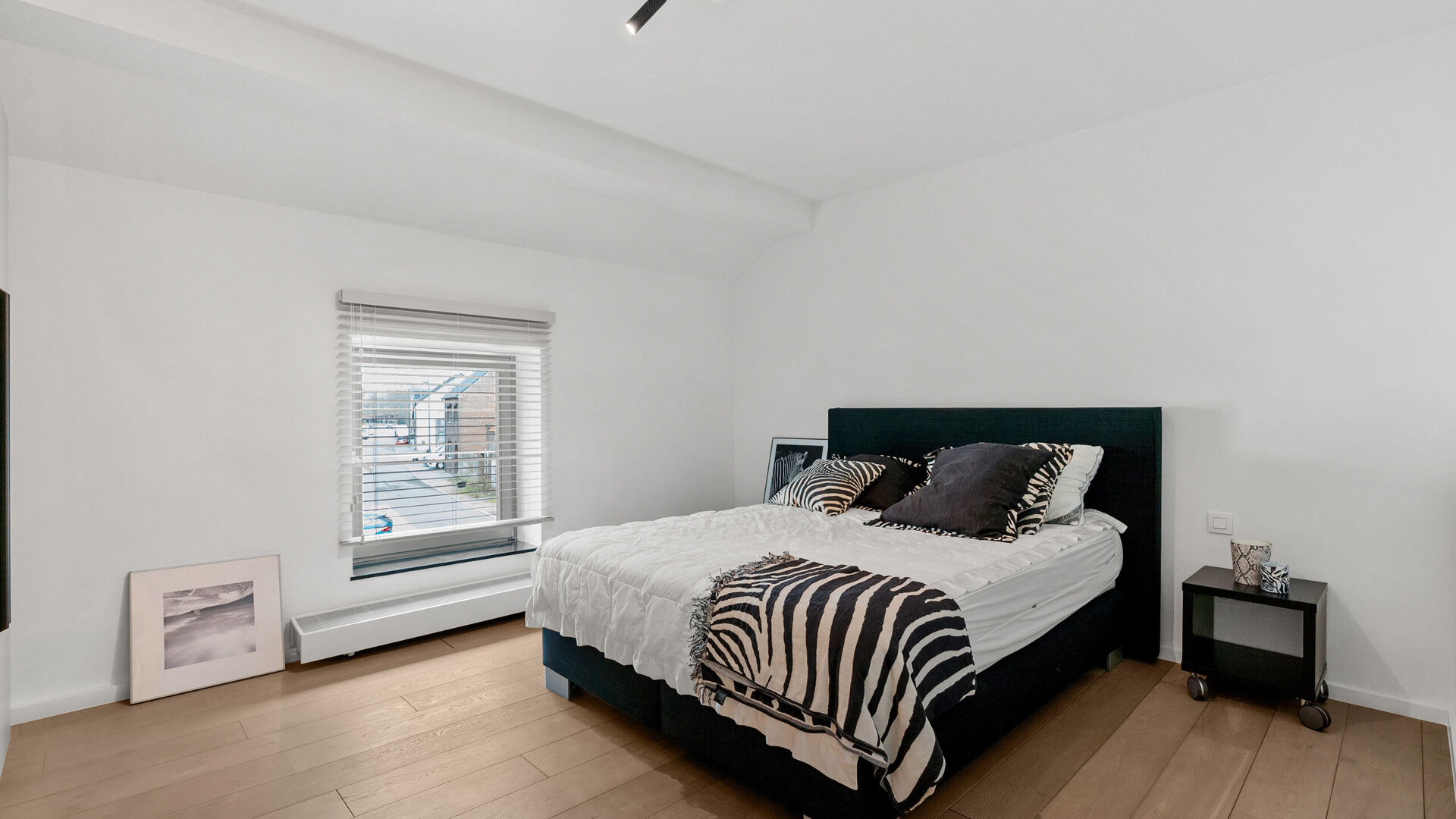 - Slaapkamer 4: zeer ruime kamer, deels onder het dak, meteigen inloopkast, bed, nachttafels en extra kasten