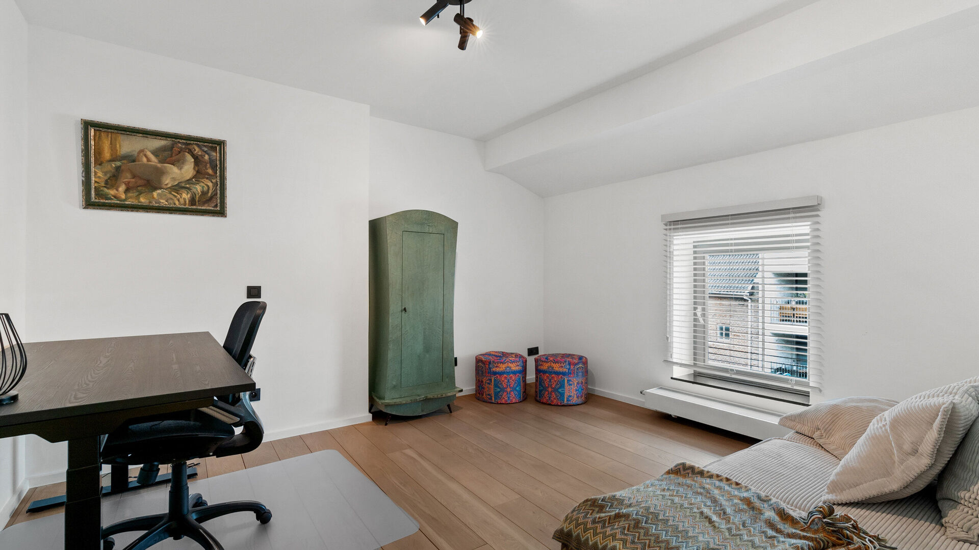 - Slaapkamer 2: momenteel ingericht als bureau en voorzien van slaapzetel, kast, bureau met bureaustoel en extra poefjes