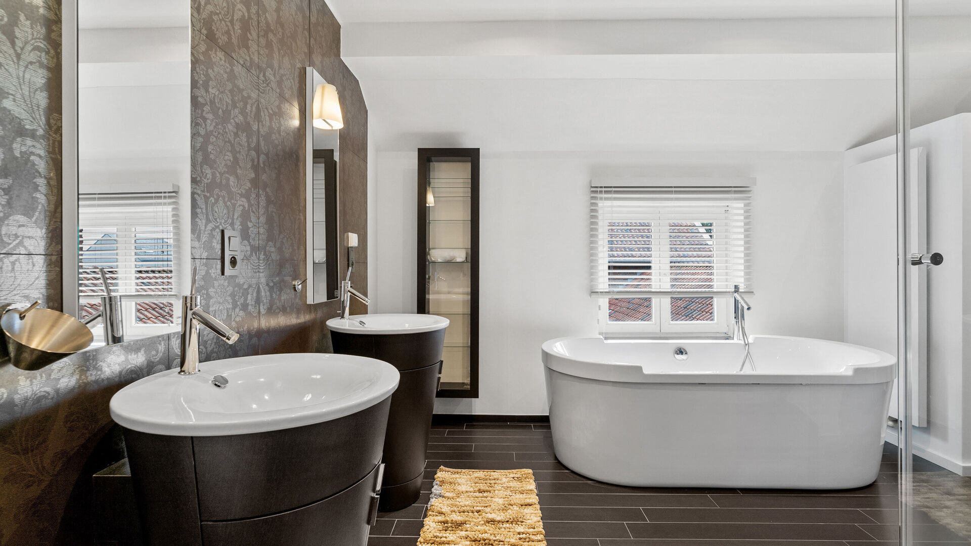 - Badkamer: twee ruime lavabo’s, ligbad, grote douche, toilet met bidet, wasmachine en droogkast