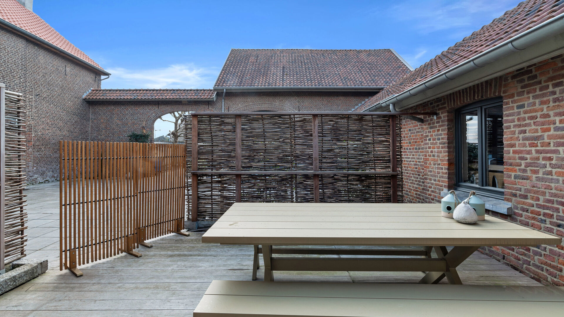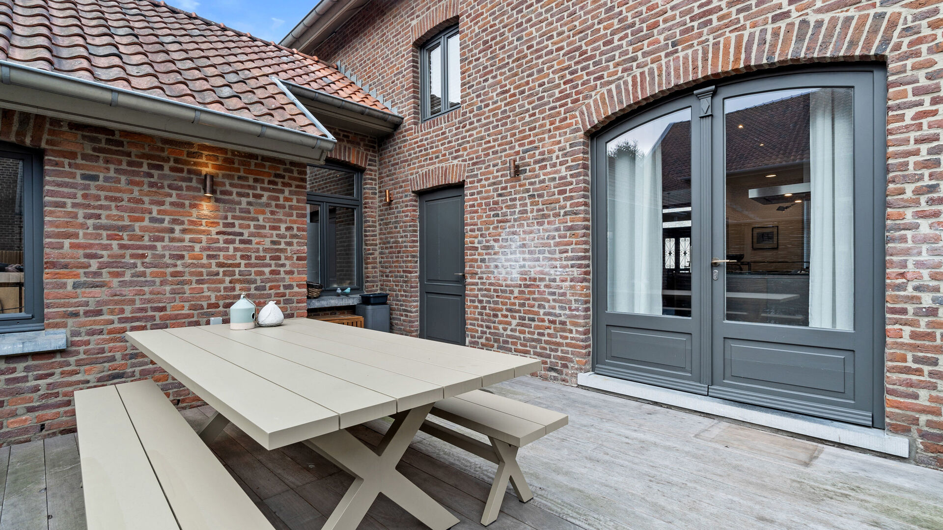 Buiten geniet je van een prachtig zonneterras, perfect voor ontspannen momenten met familie en vrienden. Het terras is uitgerust met een grote picknicktafel met banken, ligzetel en sfeervolle verlichting.