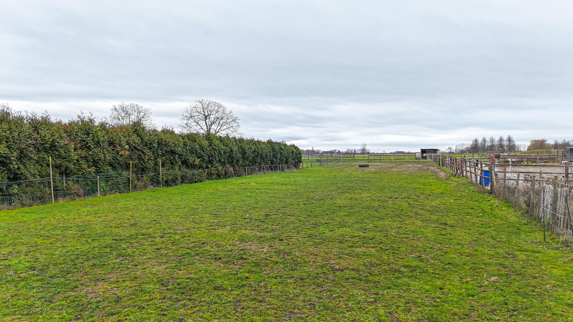 De tuin bestaat uit een ruime weide, momenteel ingericht als paardenweide en gedeeltelijk omheind, en biedt een prachtig open zicht dat rust en privacy garandeert.