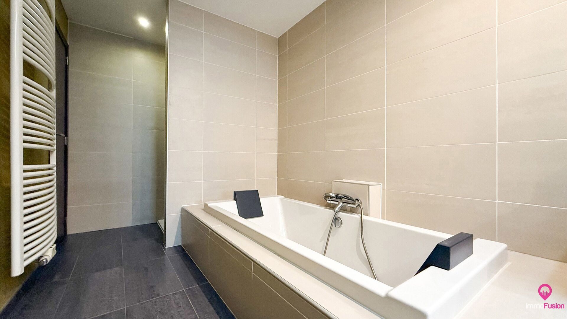 De badkamer is bijzonder royaal: uitgerust met een inloopdouche én bad, dubbele wasbak, en ontworpen voor comfort en rust.