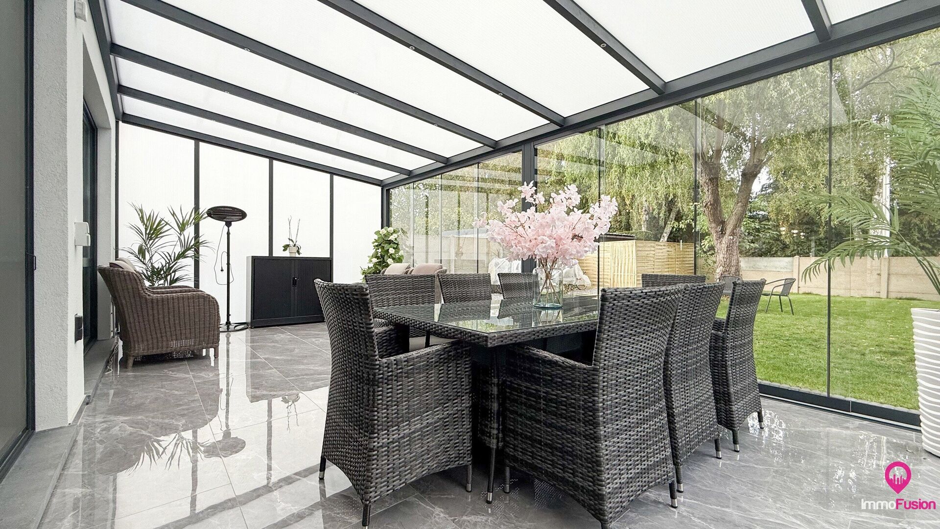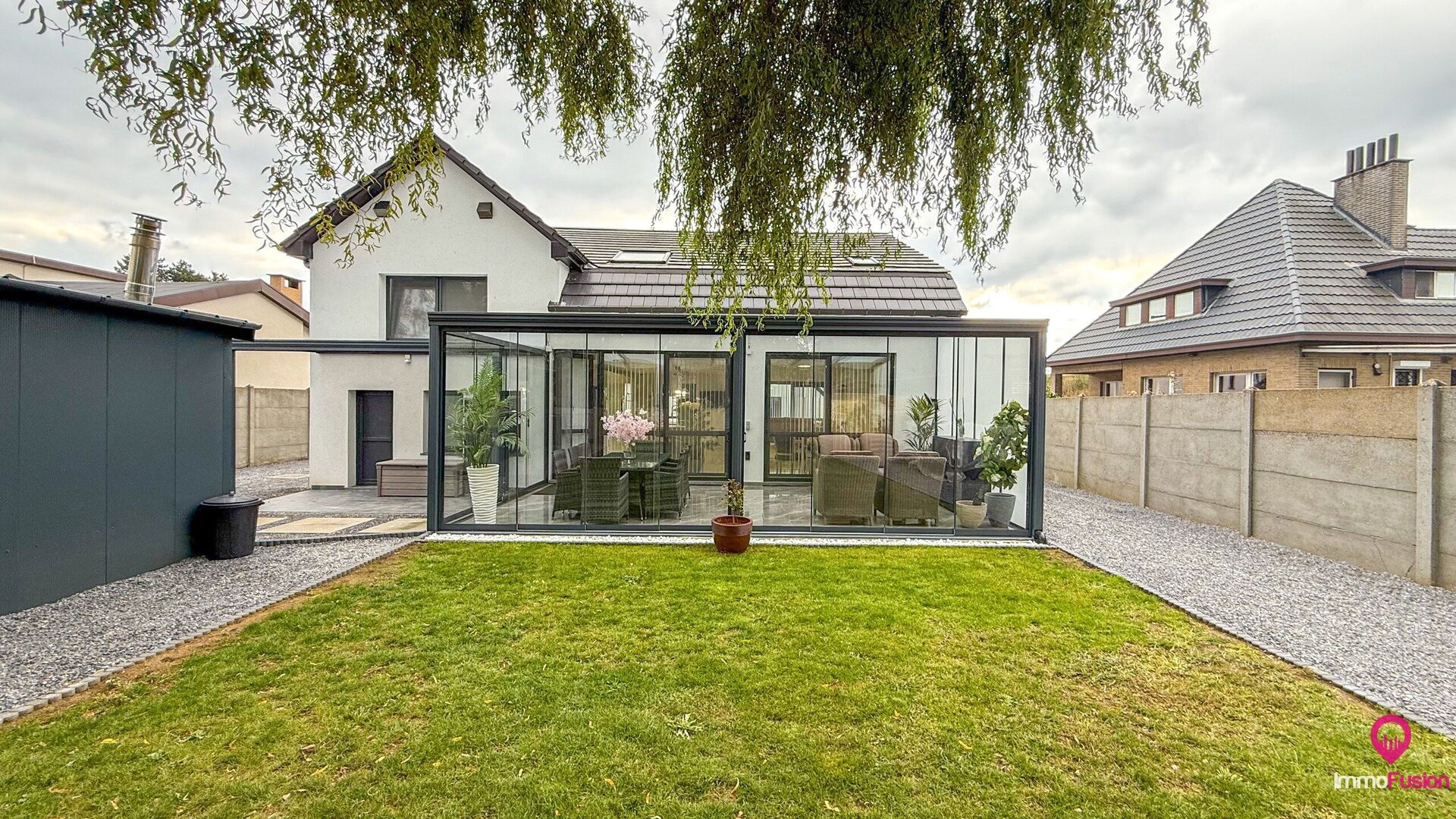 De woning beschikt over drie badkamers, elk met een toilet, waardoor comfort en privacy gegarandeerd zijn voor het hele gezin. Aan de achterzijde werd een overdekt terras met glazen schuifwanden omgevormd tot extra leefruimte, ideaal om het hele jaar door van buiten te genieten. De ruime garage biedt daarnaast volop opslagruimte en praktische mogelijkheden.