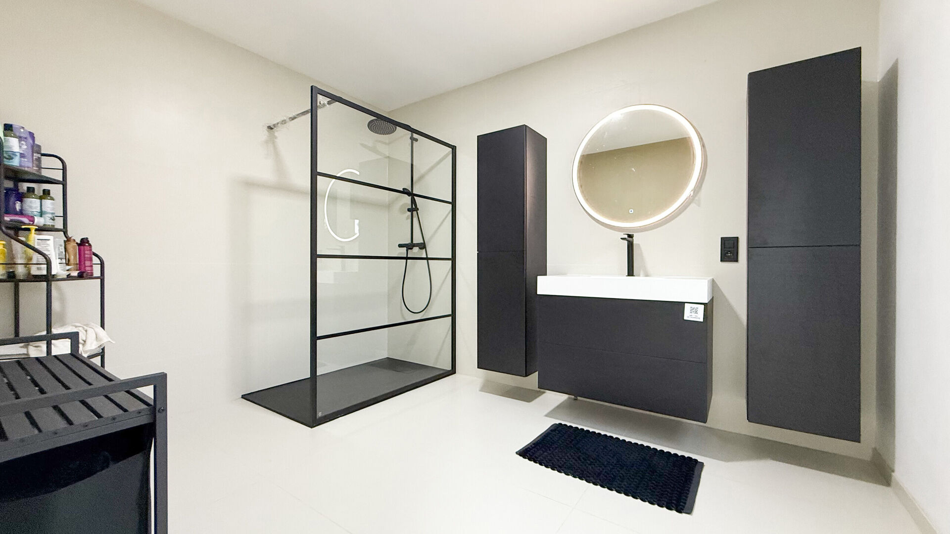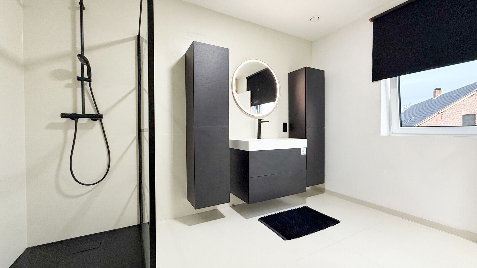 De badkamer is uitgerust met een moderne inloopdouche en enkele wastafel. Daarnaast is er op elk verdiep een apart toilet, wat het wooncomfort aanzienlijk verhoogt.