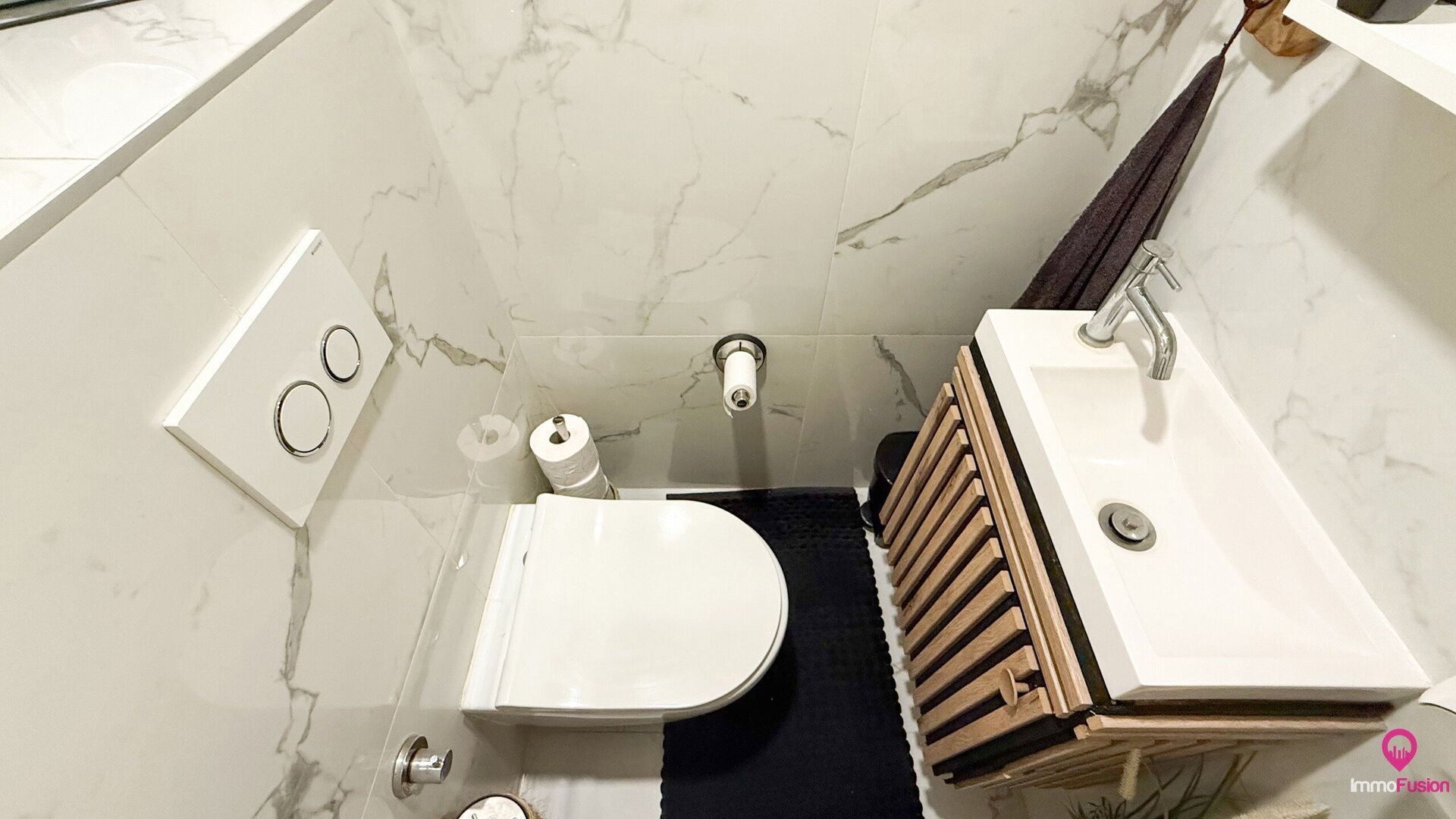 Via een kleine trap bereik je het split-level, waar de badkamer zich bevindt: modern ingericht met een inloopdouche, tweede toilet en een stijlvolle wastafel. Verder vind je drie ruime slaapkamers, elk met voldoende lichtinval en indelingsmogelijkheden. Perfect voor een gezin of wie graag een extra bureauruimte voorziet.