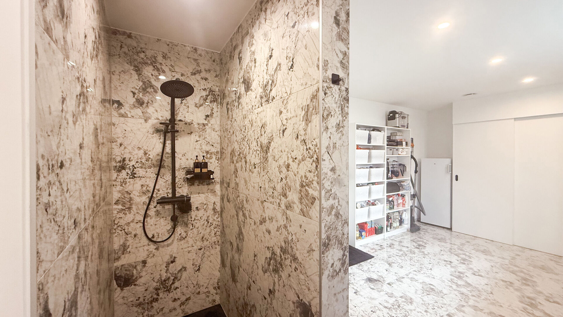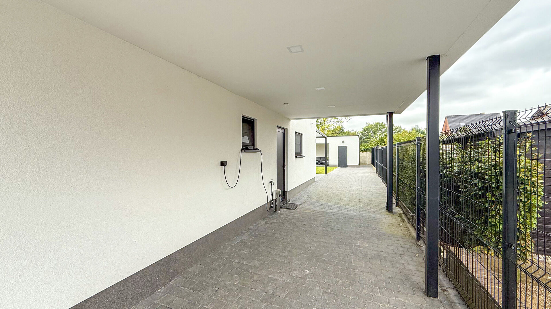 Buitenruimte: De aangelegde tuin is bereikbaar via het schuifraam aan de keuken en beschikt over een overdekt terras en een ruim tuin- of poolhouse – ideaal voor ontspanning of hobbyruimte.
