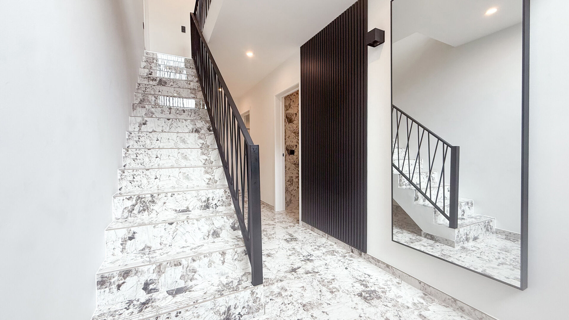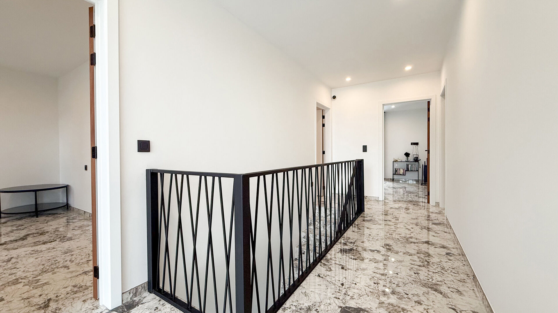 Verdieping: Via de stijlvolle trap kom je op de overloop die toegang biedt tot de badkamer en vier volwaardige slaapkamers, waarvan één met eigen dressing en aparte badkamer.