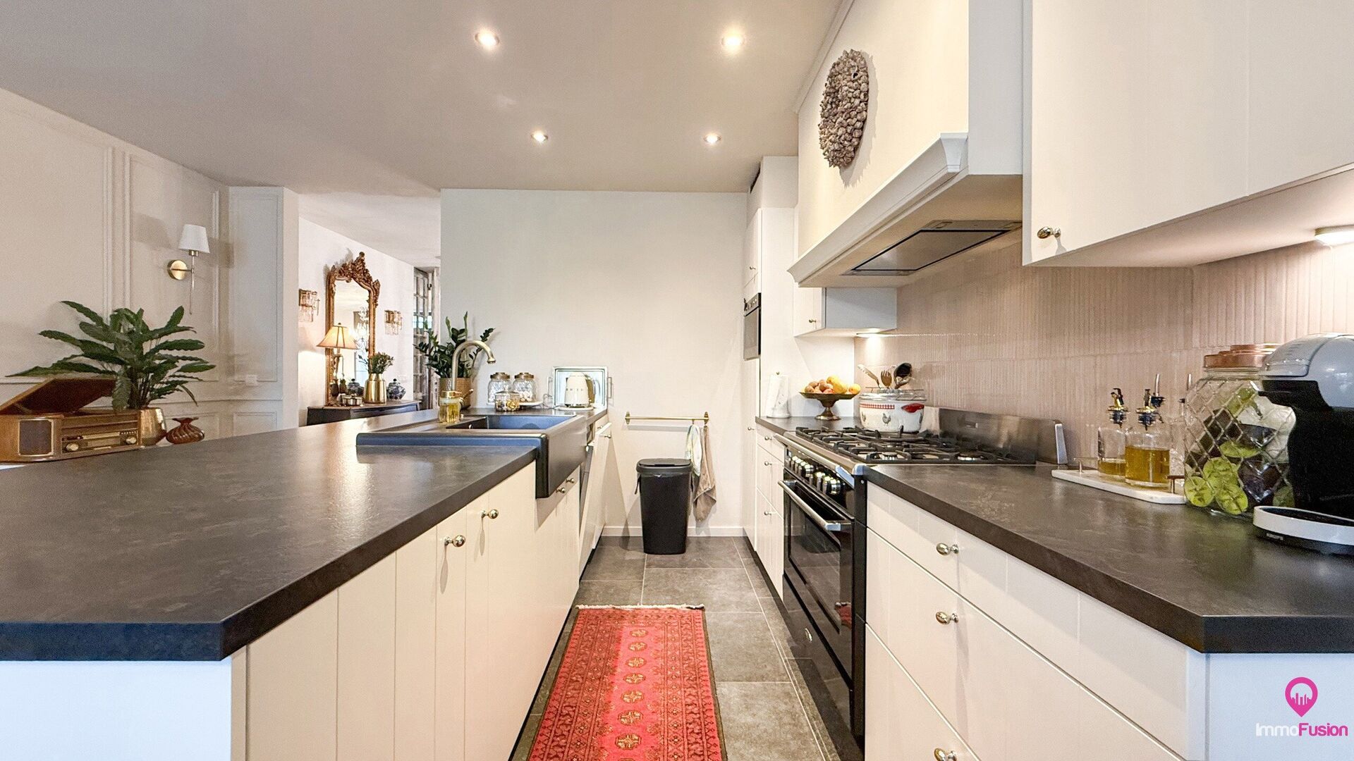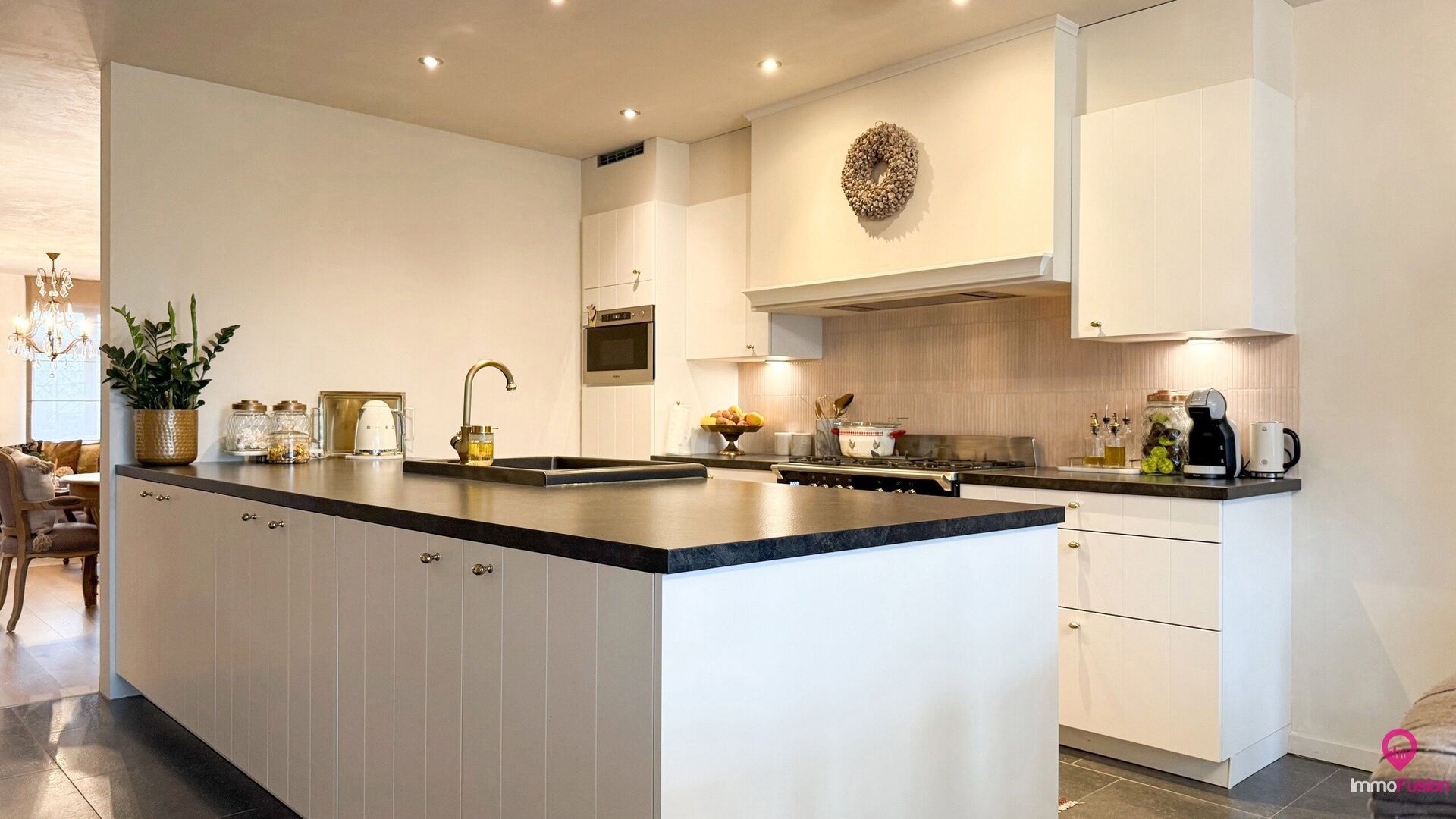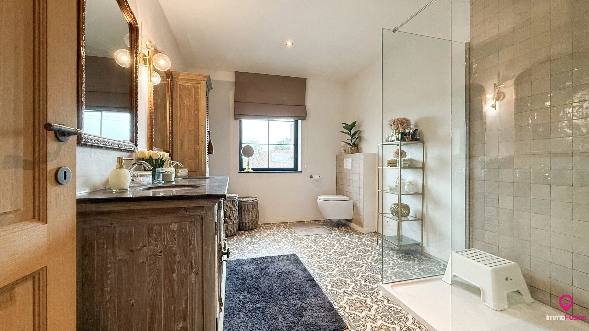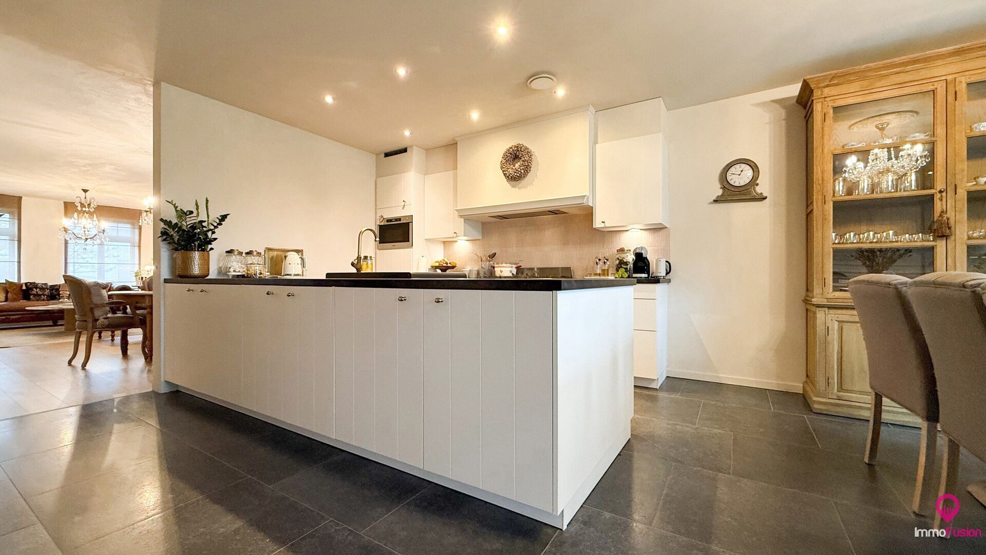 Achteraan de woning bevindt zich de betoverende landelijke keuken, uitgerust met een keukeneiland, gasfornuis, vaatwasser en alle gebruikelijke toestellen. Dankzij de open indeling geniet je hier van een aangename connectie met de leefruimte. Aansluitend is er een open bureauruimte voorzien, ideaal voor thuiswerk of als speelhoek.