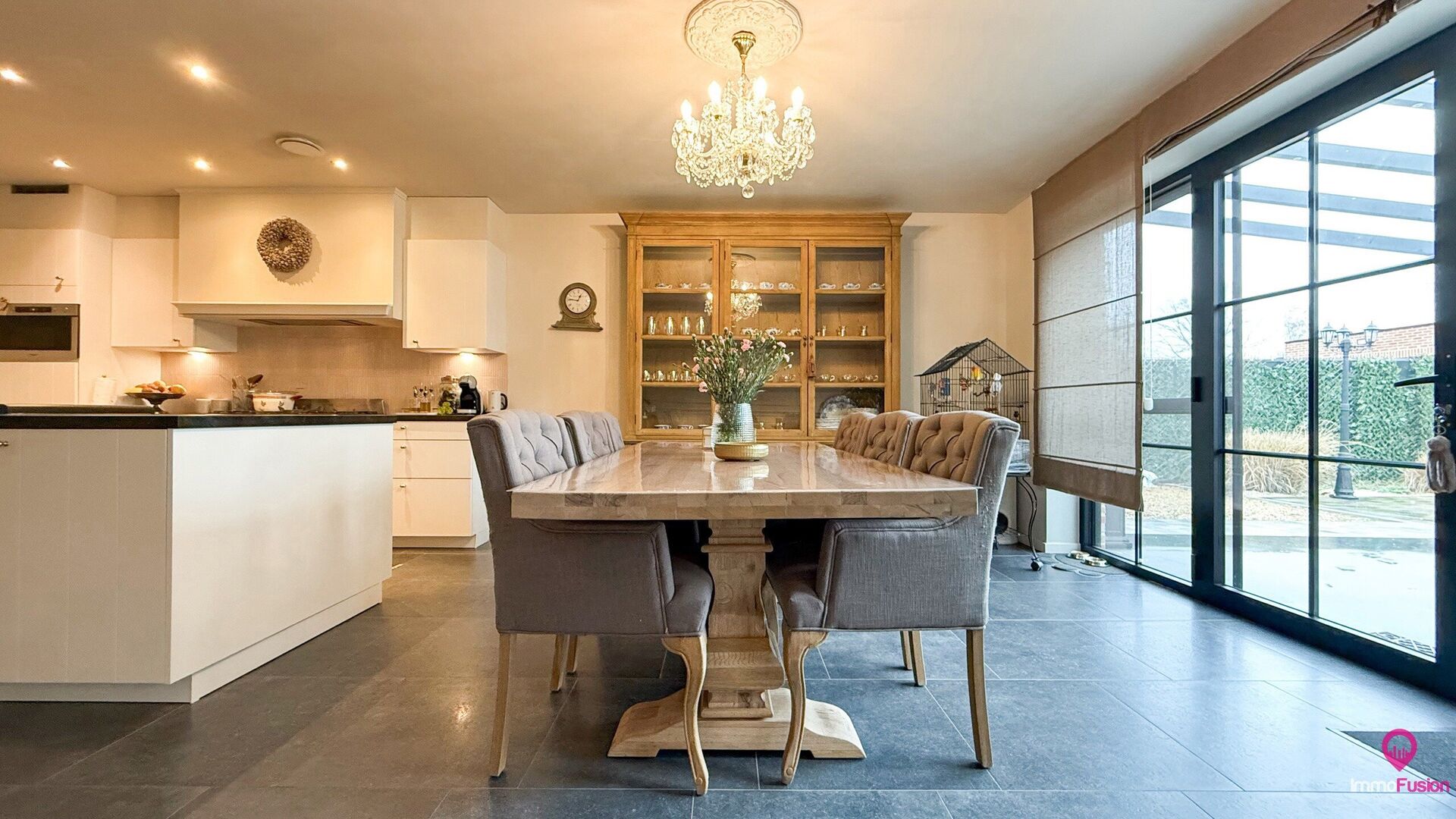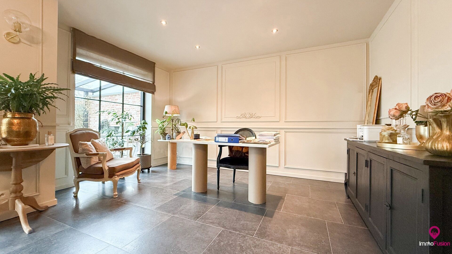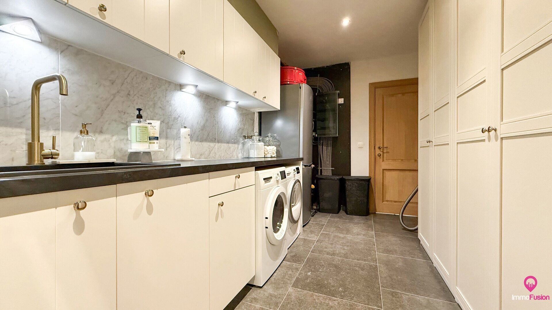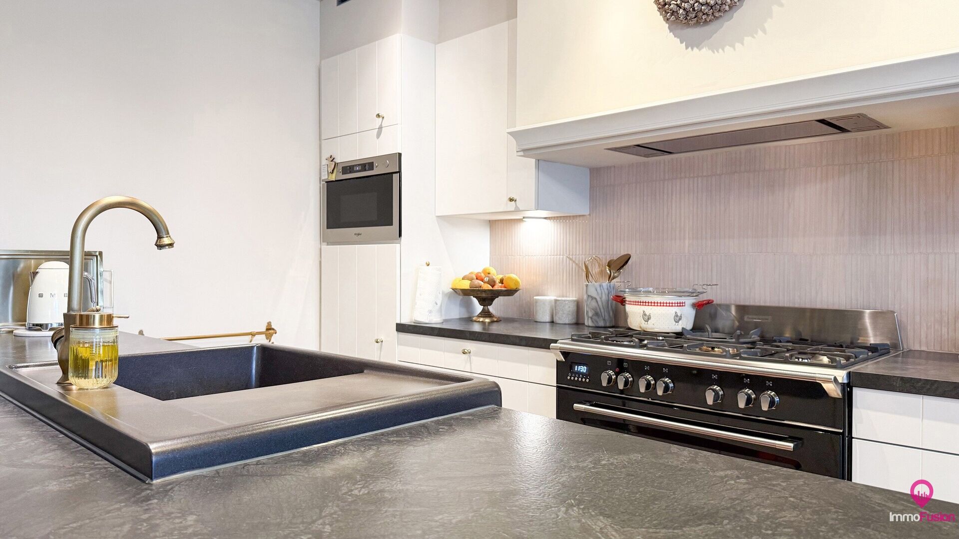 Achteraan de woning bevindt zich de betoverende landelijke keuken, uitgerust met een keukeneiland, gasfornuis, vaatwasser en alle gebruikelijke toestellen. Dankzij de open indeling geniet je hier van een aangename connectie met de leefruimte. Aansluitend is er een open bureauruimte voorzien, ideaal voor thuiswerk of als speelhoek.