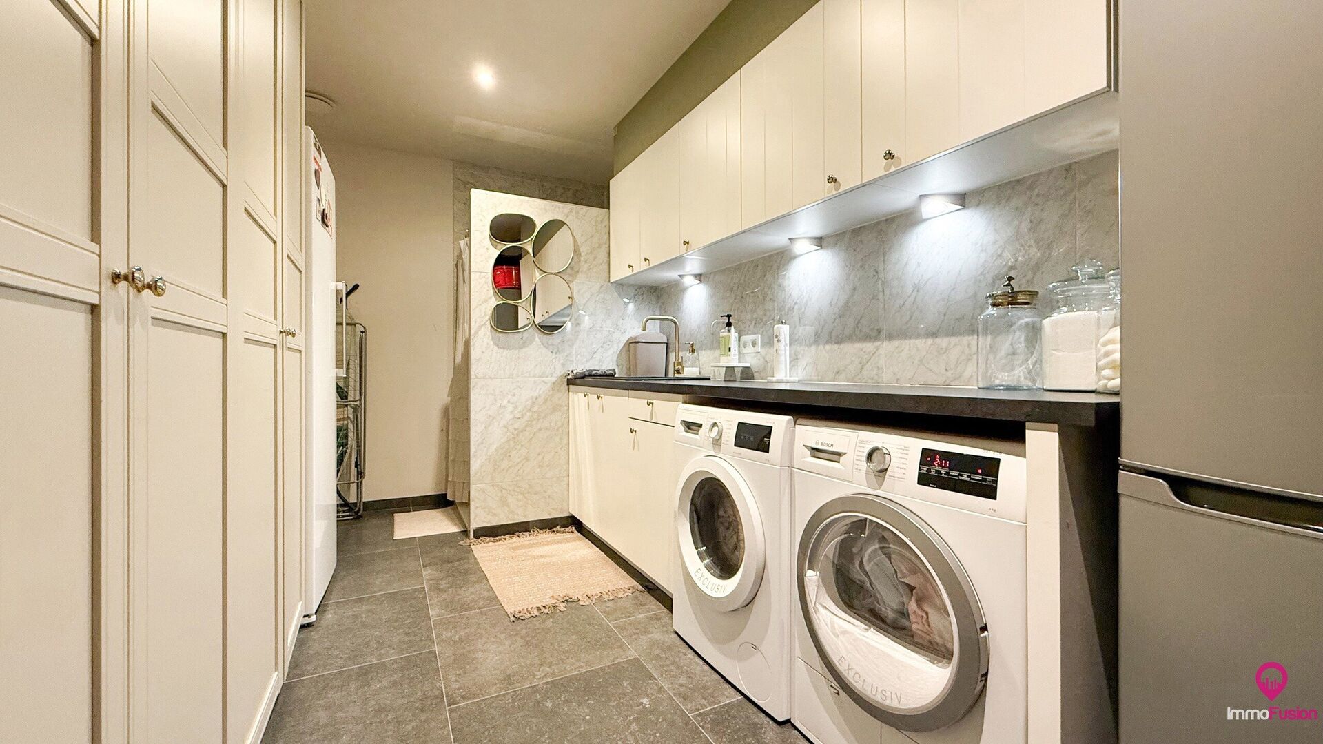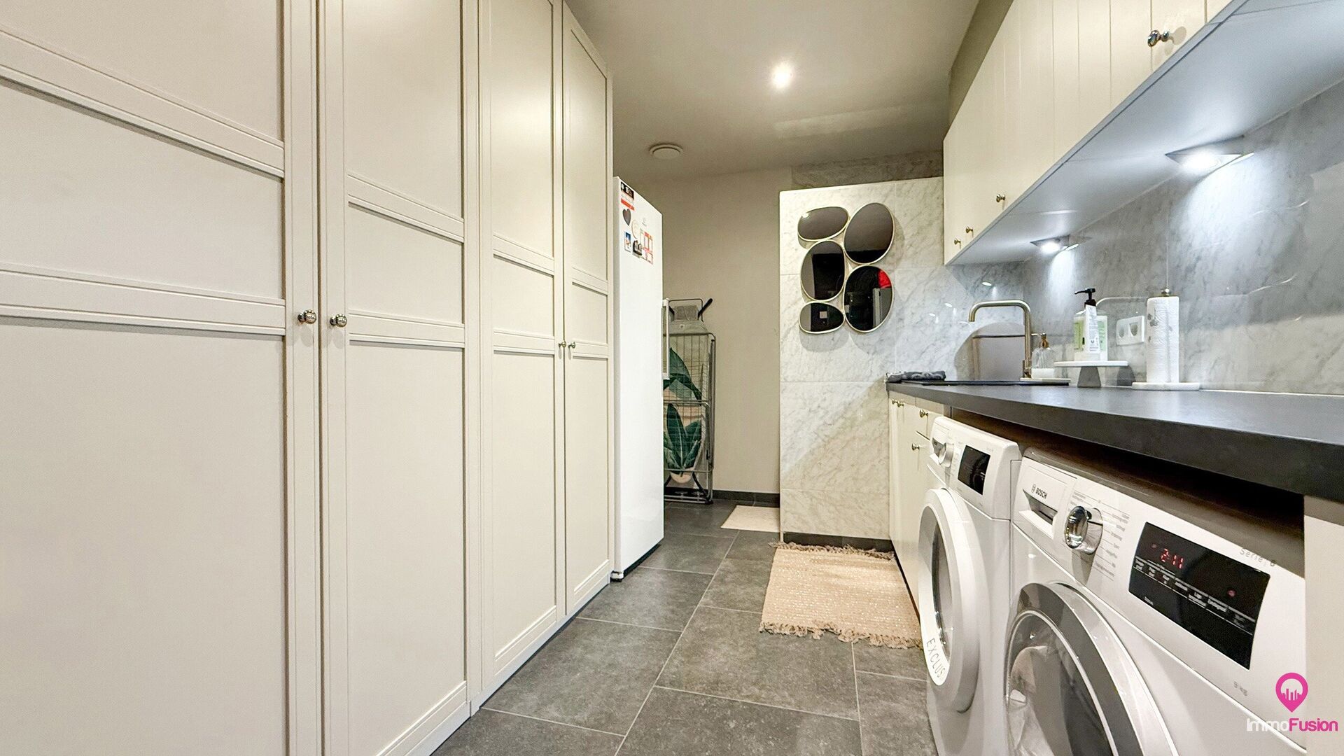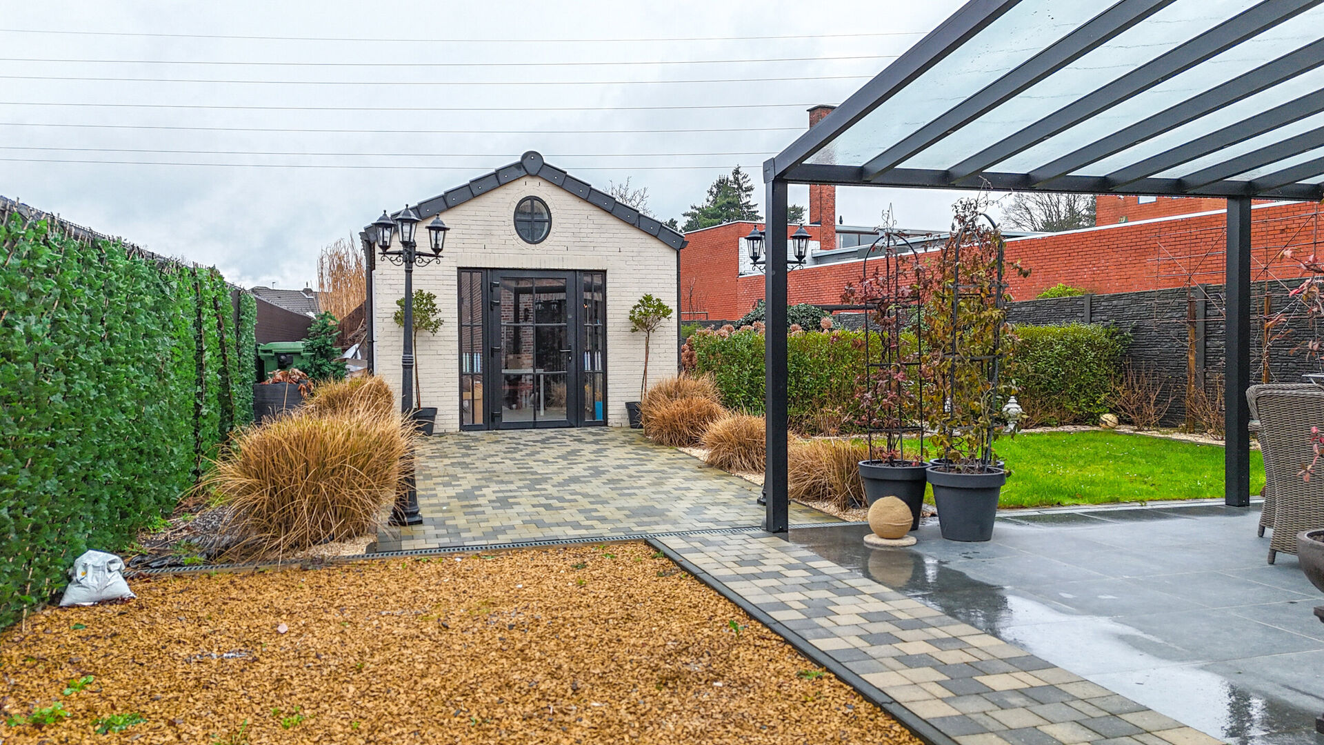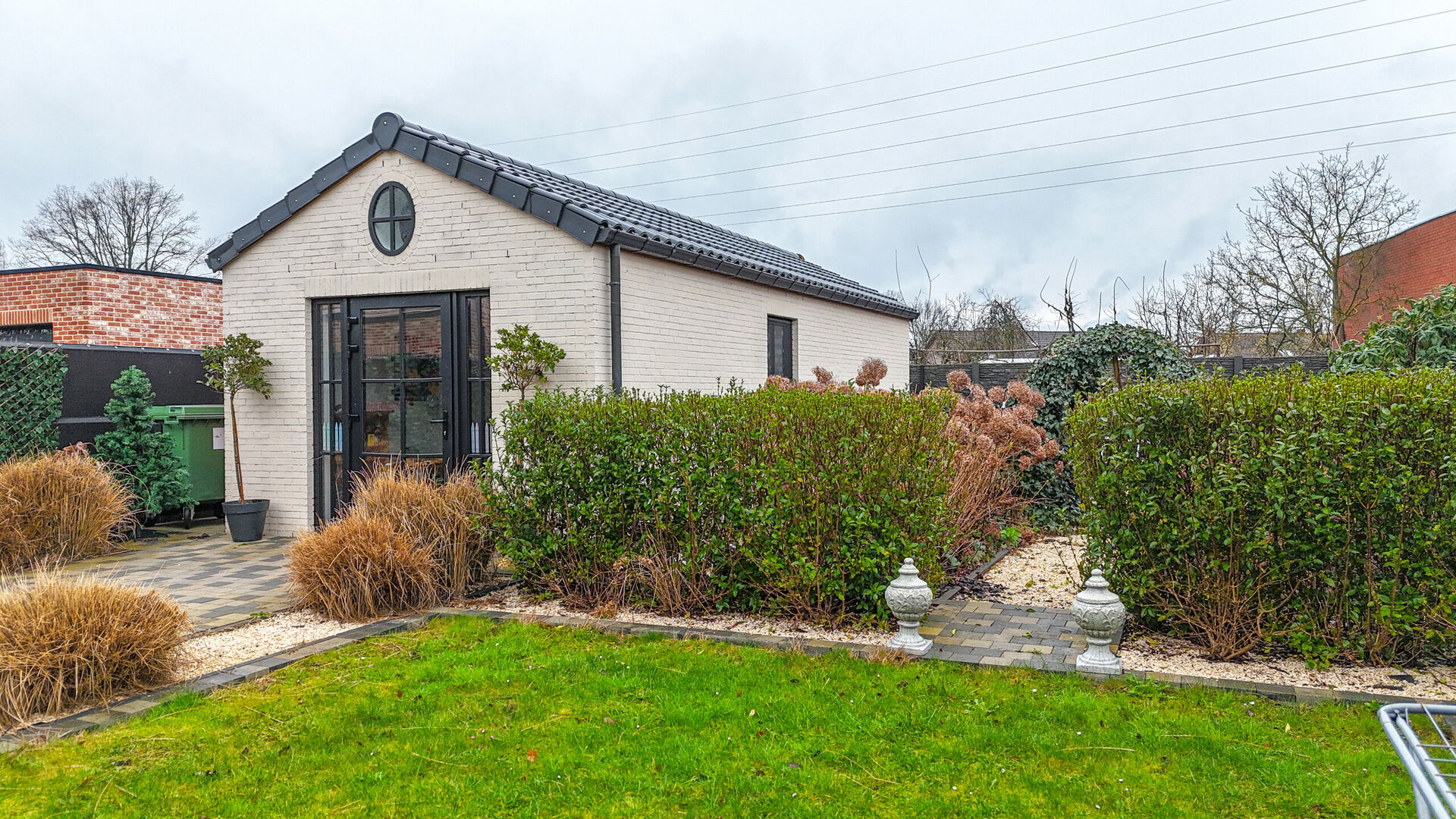 Naast de keuken vind je een praktische berging/wasruimte met extra doucheruimte, wat zorgt voor bijkomend comfort en functionaliteit. Vanuit de keuken heb je directe toegang tot het overdekte terras en de volledig omheinde tuin, waar het heerlijk vertoeven is in alle privacy. Het aanwezige tuinhuis biedt extra opbergruimte.