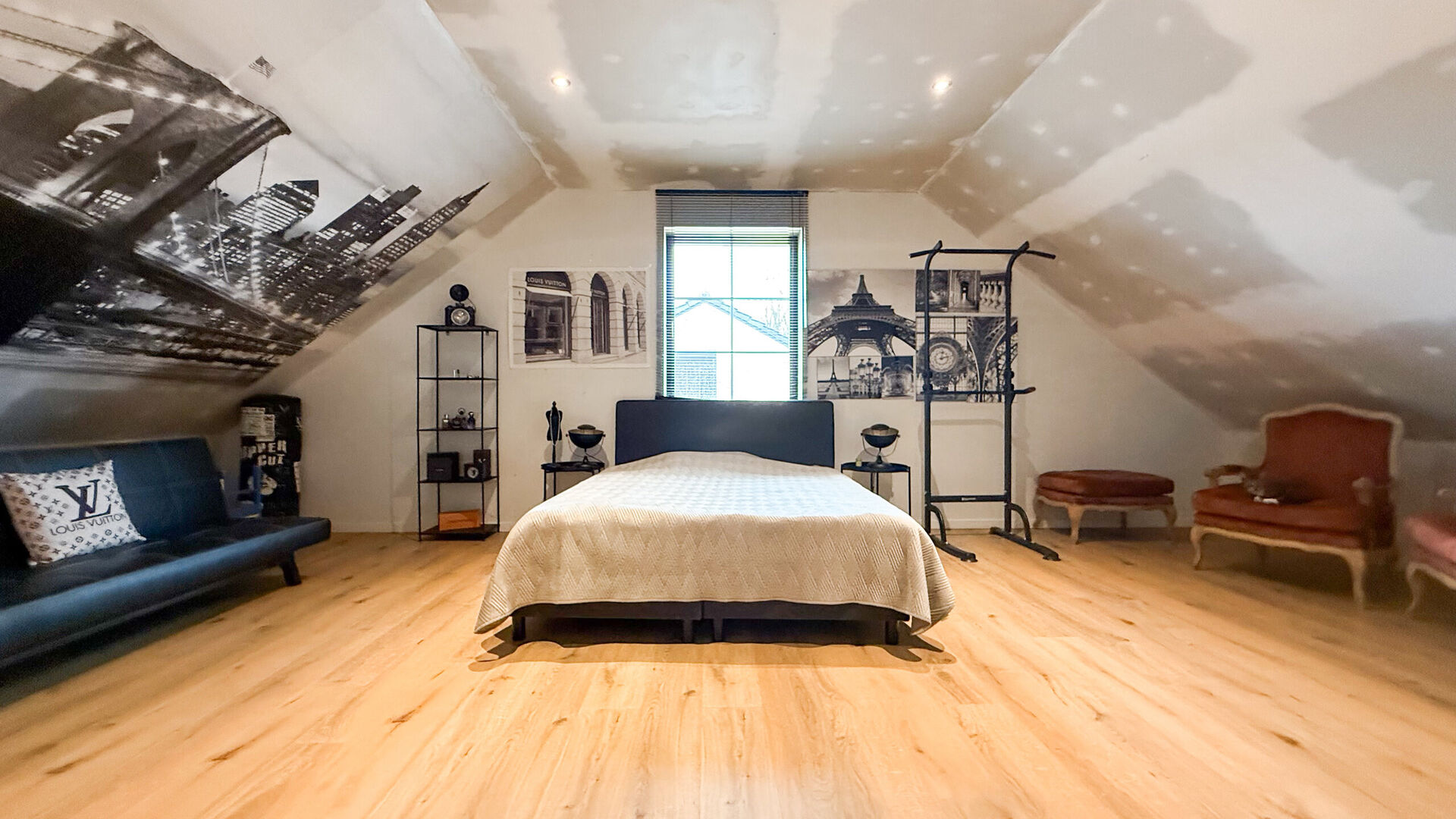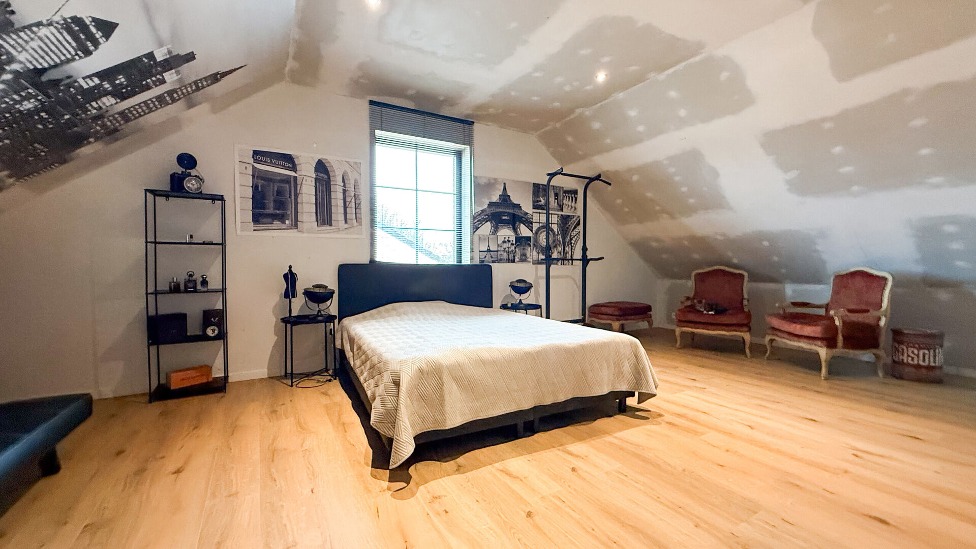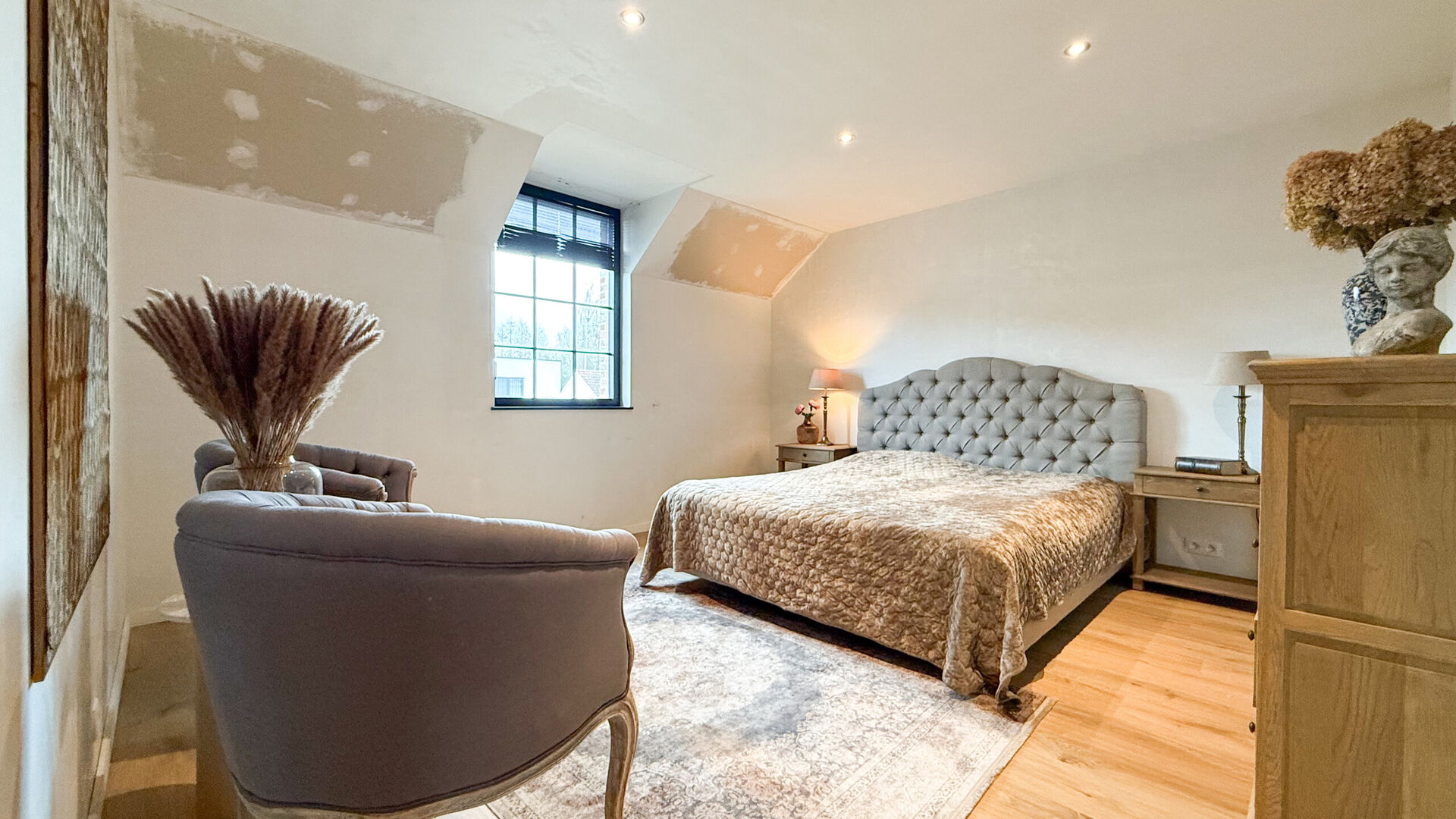 Op de bovenverdieping bevinden zich drie imposante slaapkamers, waarvan één met dressing. De betoverende badkamer is centraal gelegen en praktisch ingericht. Via een vaste trap bereik je de zolderverdieping, waar momenteel een vierde slaapkamer is ingericht – ideaal als extra slaapruimte, hobbykamer of bureau.