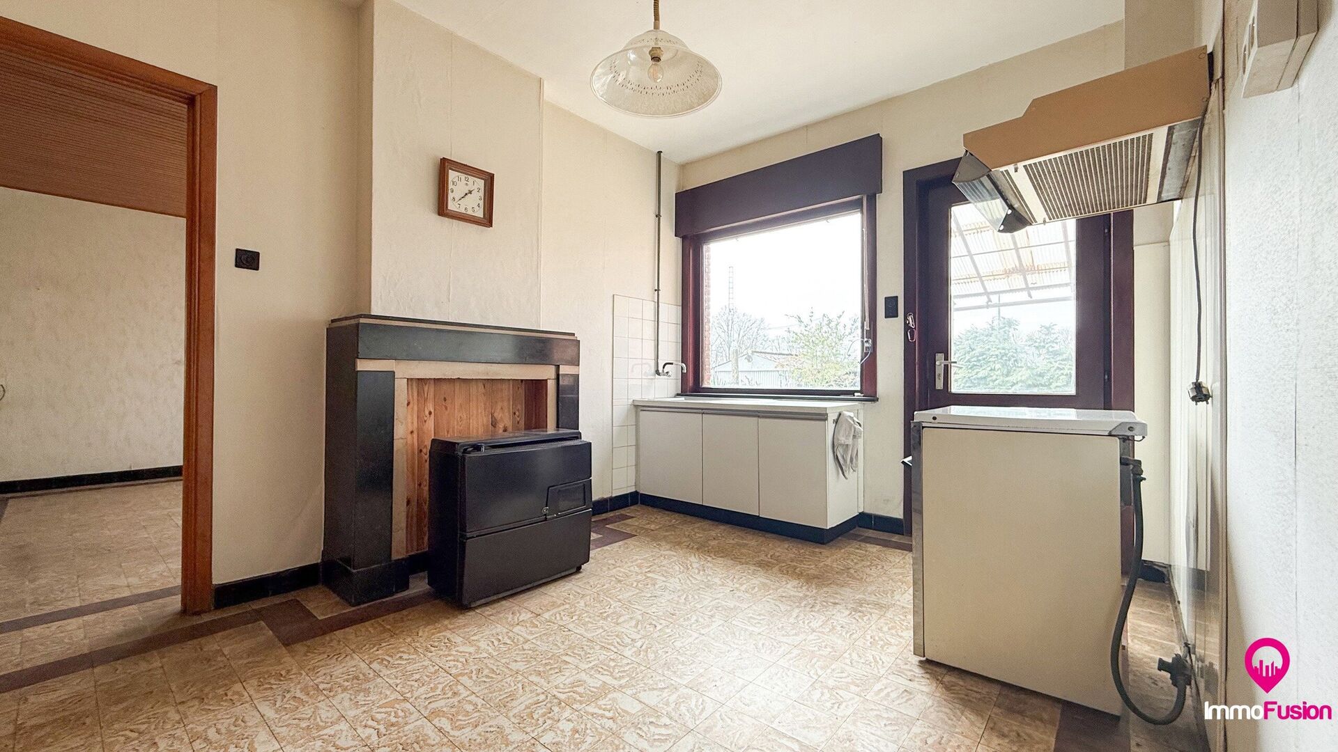 Aansluitend bevindt zich de keuken, uitgerust met een spoelbak, oven en gasvuur met deksel, evenals een dampkap. Ook hier is een mazoutkachel aanwezig, wat bijdraagt aan het gezellige karakter van de woning. De keuken biedt bovendien voldoende ruimte om een eettafel te plaatsen en geeft directe toegang tot de tuin, ideaal voor wie graag binnen en buiten met elkaar verbindt.