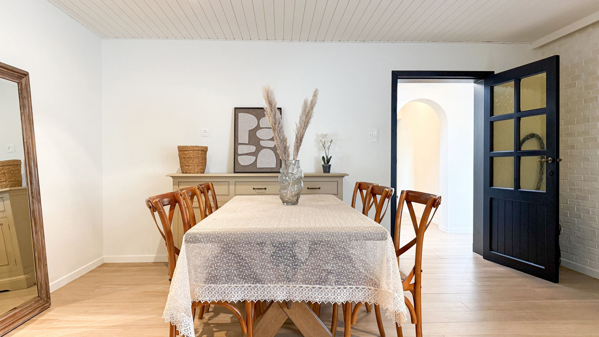 Bij het betreden van de woning komt u terecht in een royale inkomhal met voldoende plaats voor vestiaire en een trap die u naar de bovenverdieping leidt. Vanuit de hal wandelt u door naar de lichtrijke en open leefruimte, waar een gezellige zithoek en eetruimte naadloos in elkaar overvloeien. De open indeling zorgt voor een aangenaam ruimtelijk gevoel en vormt het hart van de woning.
