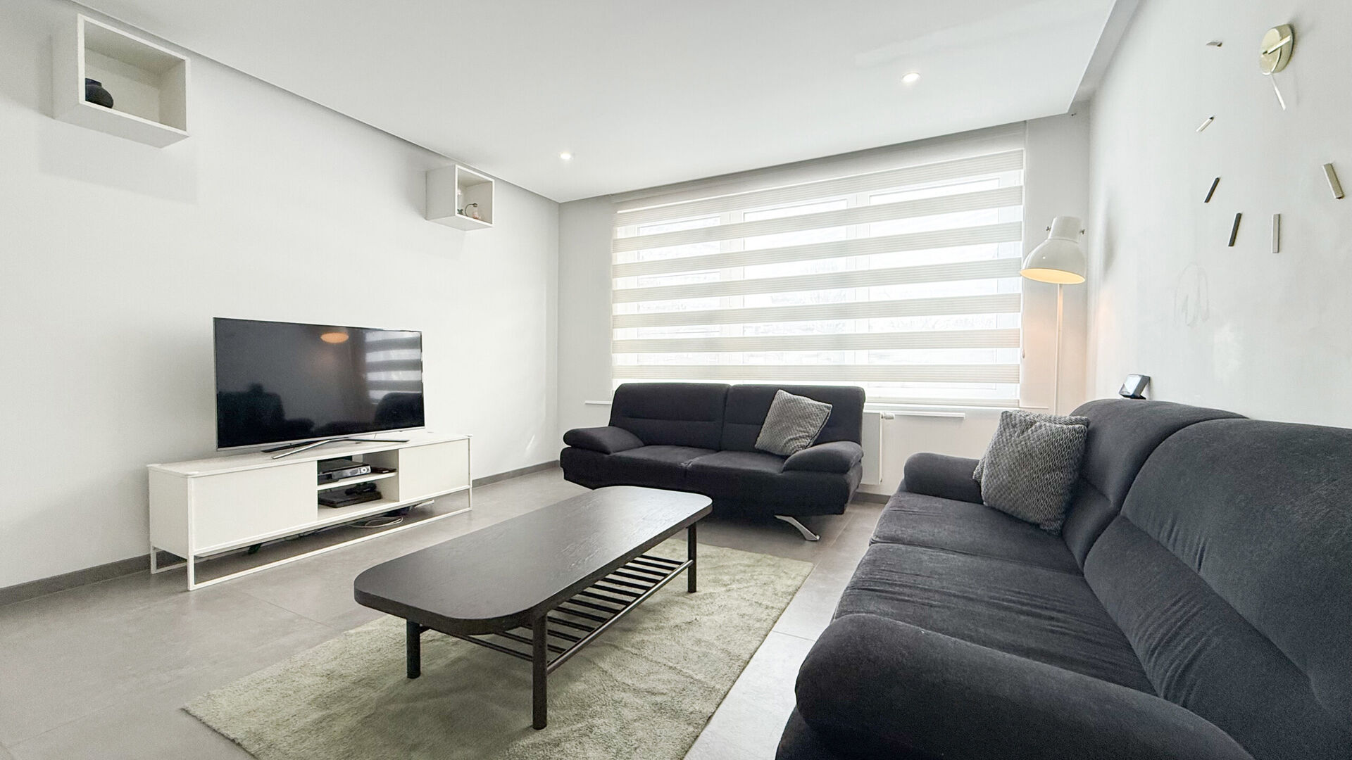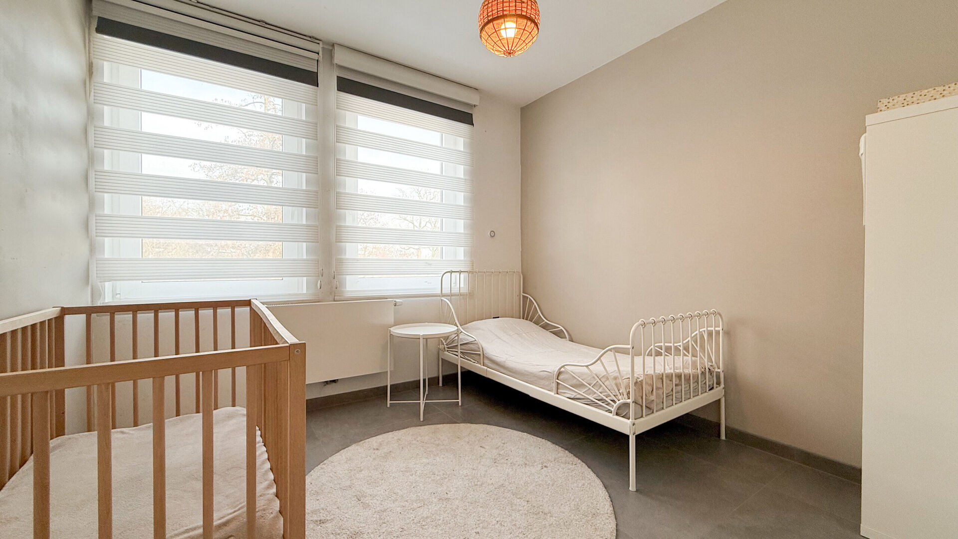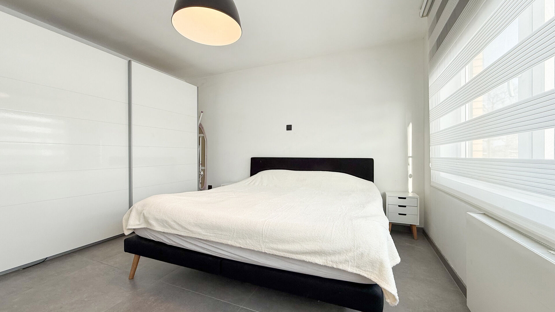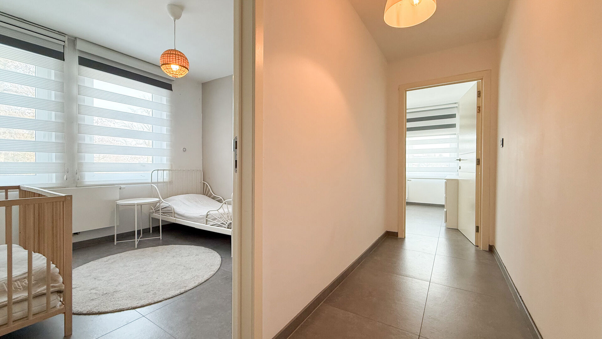 De woning beschikt over twee slaapkamers en een ruime, open keuken die naadloos aansluit op de leefruimte, wat zorgt voor een modern en lichtrijk geheel. Dankzij de grote raampartijen geniet u van een overvloed aan natuurlijk licht doorheen de volledige woning.