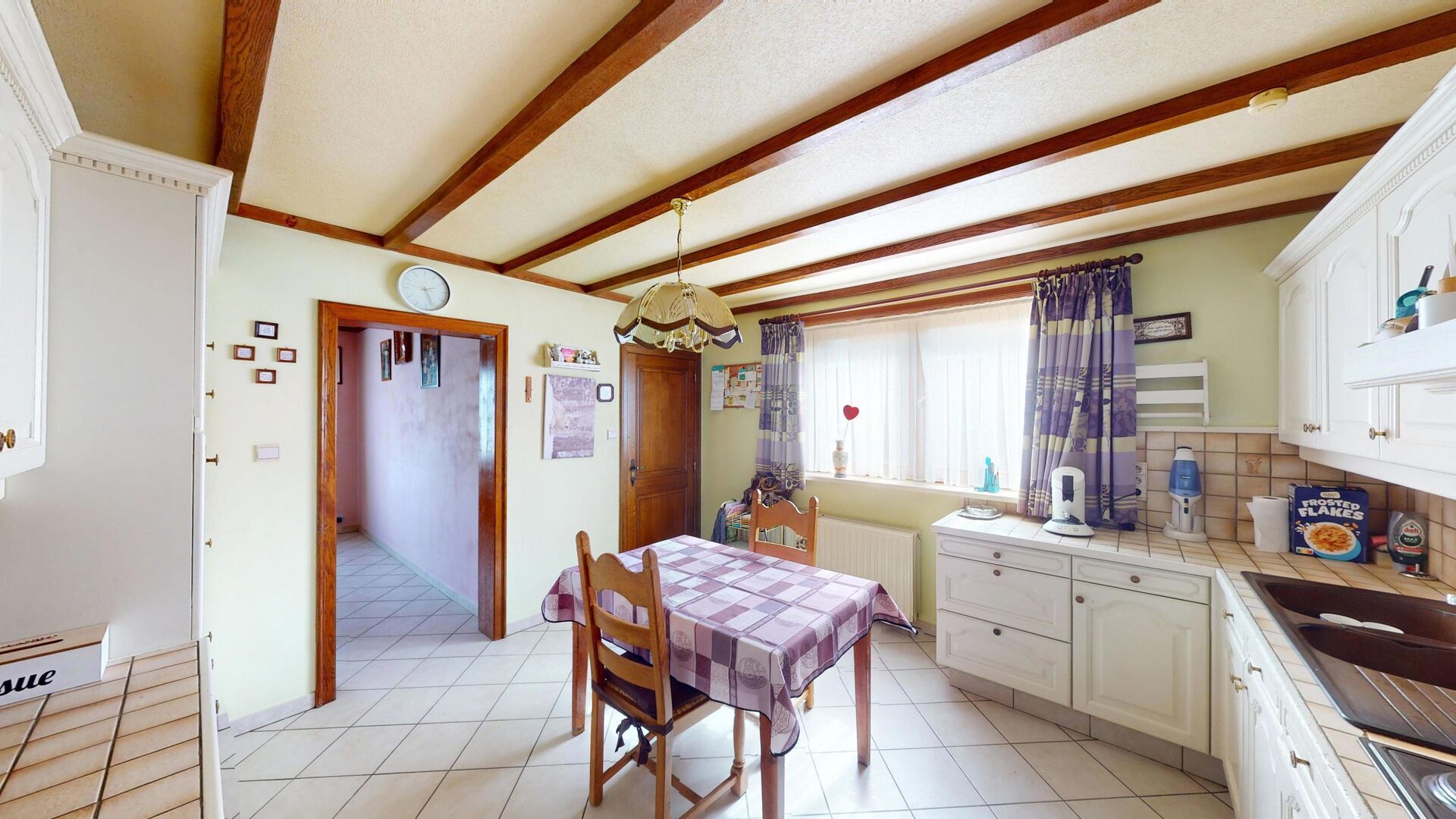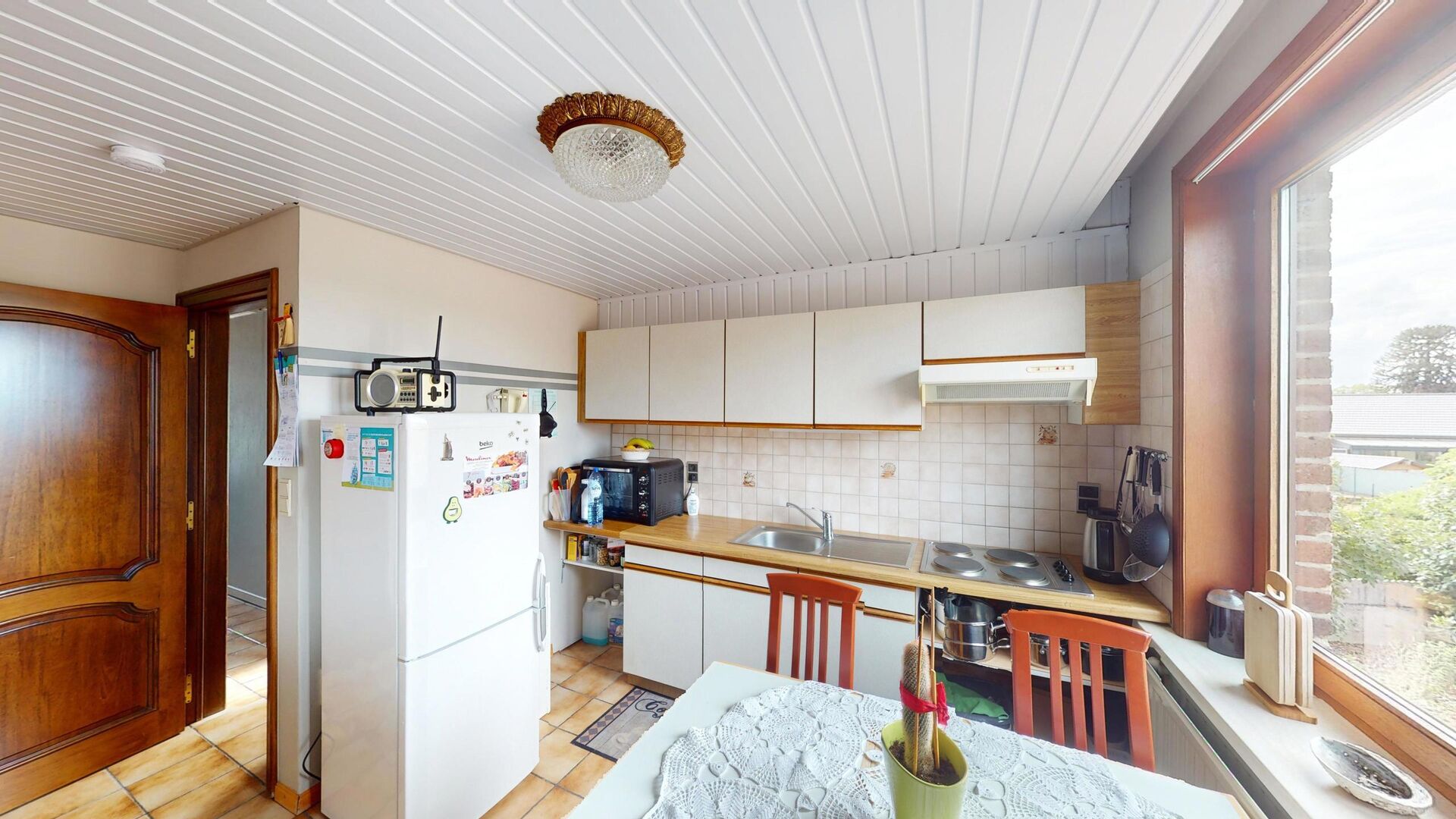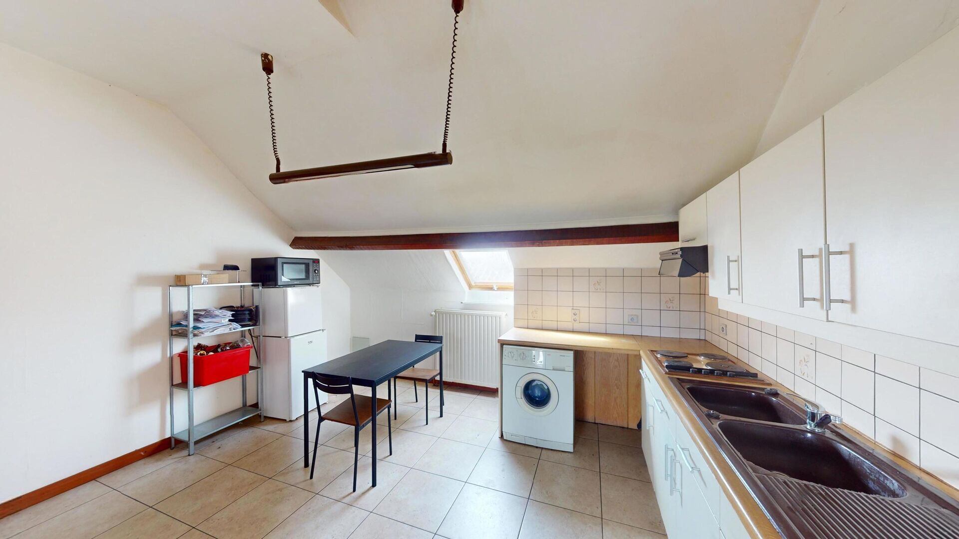 Naast de leefruimte komen we in de deels geïnstalleerde keuken, waar we oa een elektrisch vuur hebben. Hier is voldoende ruimte voorzien om een tafel en stoelen te plaatsen.