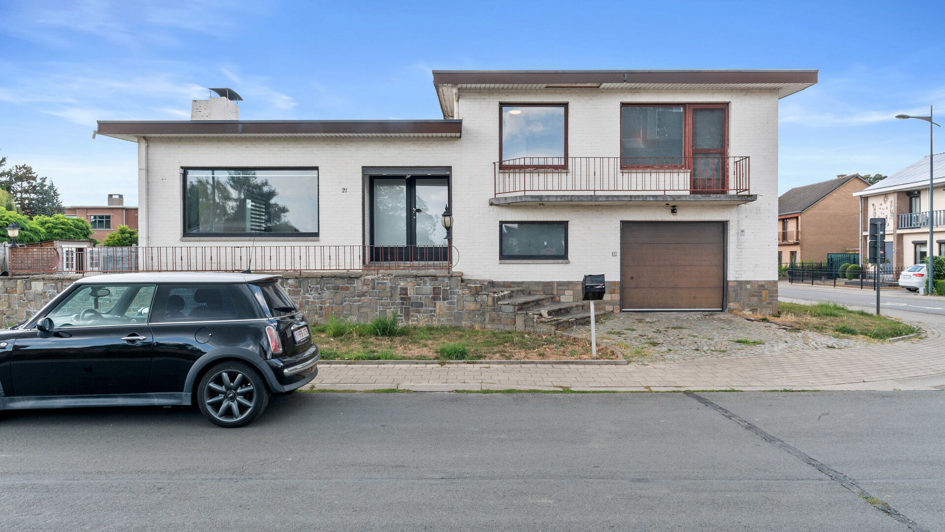 De woning is gebouwd in 1964 en bevindt zich op een perceel met graspartij rondom, een oprit in kiezel en een verhoogd terras aan de voorzijde. Via de trap en beklinkerde toegang bereik je de inkomhal met aansluiting op het alarmsysteem (Verisure).
