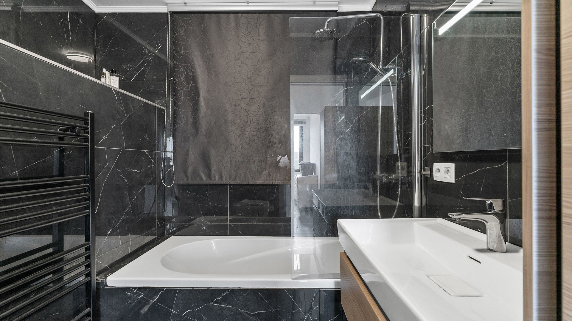 Een niveau hoger bevinden zich drie slaapkamers, allemaal voorzien van vernieuwde, lichtgrijze tegelvloer en grote ramen. De badkamer is eveneens vernieuwd en uitgerust met ligbad en douchewand, lavabo met spiegel en kolomkast, sierradiator en tweede hangtoilet.