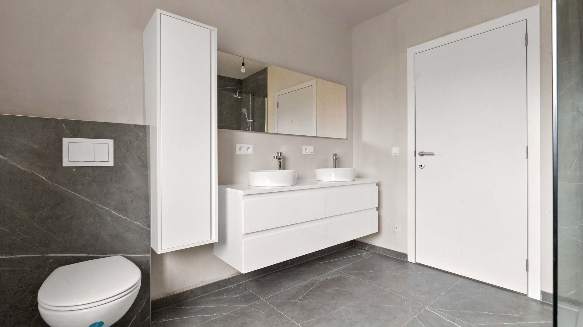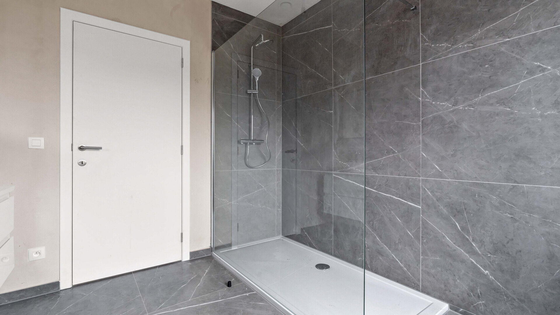 De stijlvolle badkamer is uitgerust met een prachtige, ruime inloopdouche en kwalitatieve afwerkingen die zorgen voor een spa-gevoel in eigen huis.