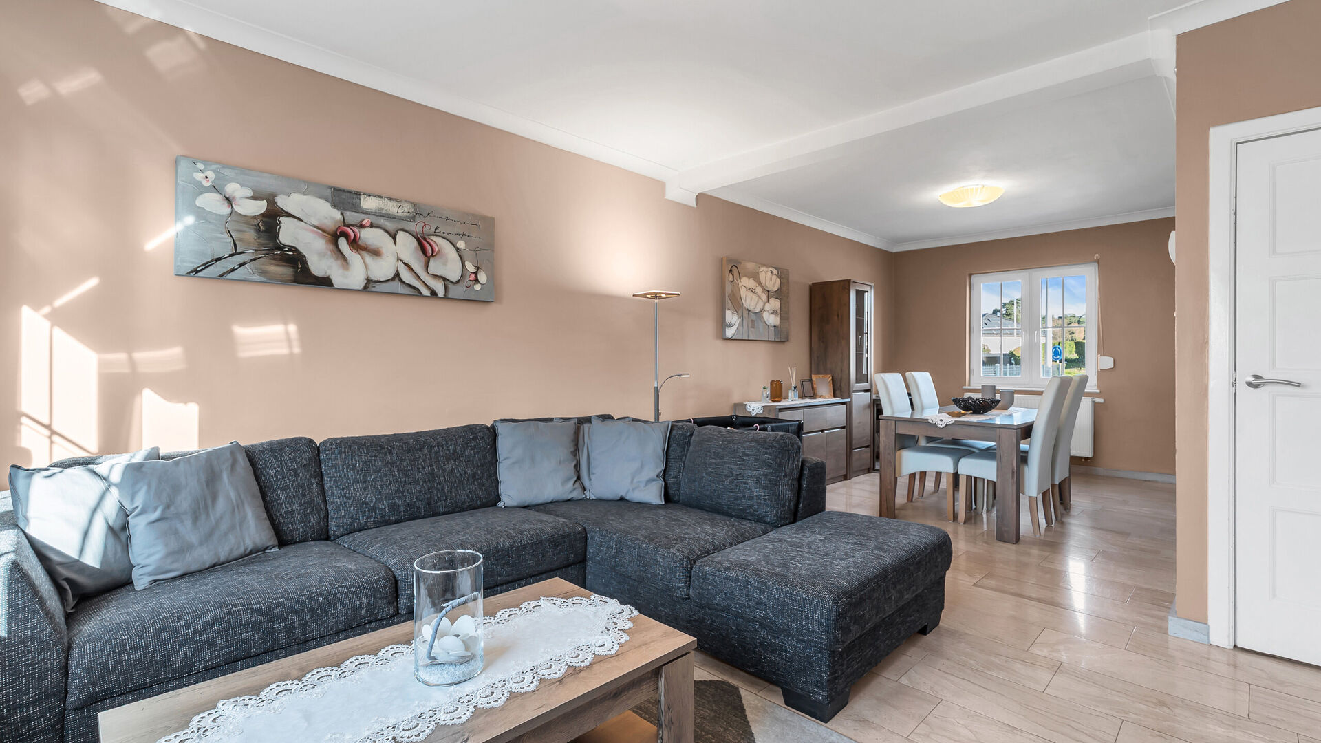 Bij het betreden van de woning komt u in de inkomhal die toegang geeft tot zowel de leefruimte als de keuken. Rechts bevindt zich de gezellige leefruimte, afgewerkt met een elegante marmeren vloer en veel natuurlijke lichtinval. Links vindt u de praktische keuken, voorzien van een gasvuur en combi-oven. Beide ruimtes lopen achteraan mooi in elkaar over via een tussenhal, waardoor er een aangename connectie is zonder in te boeten aan privacy.