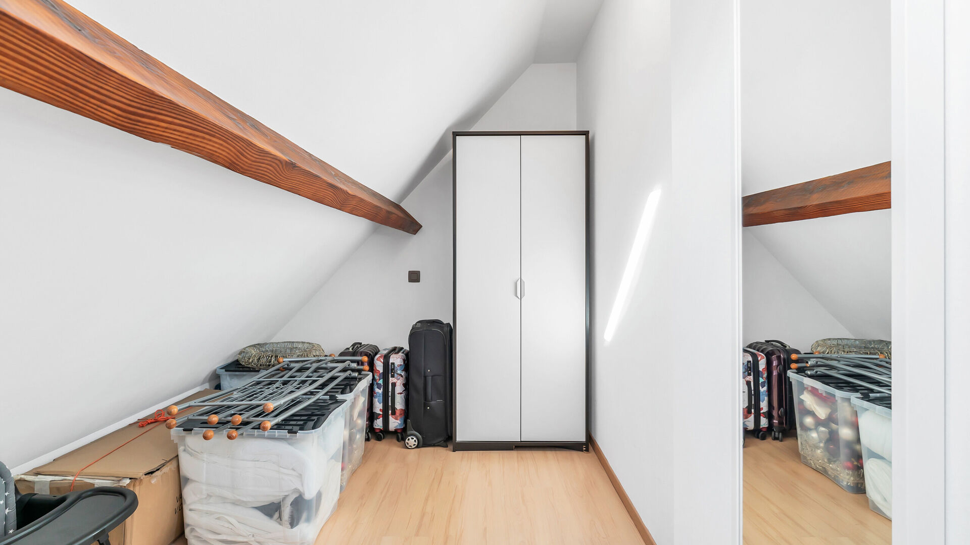 Op de verdieping bereikt u via een houten trap drie slaapkamers, waarvan twee ruime en één veelzijdige kamer die perfect kan dienen als kinder-, bureau- of hobbyruimte. Eén van de slaapkamers beschikt bovendien over een eigen lavabo en toilet. De bovenverdieping is volledig afgewerkt met een warme laminaatvloer en geniet van extra licht dankzij de dakramen.