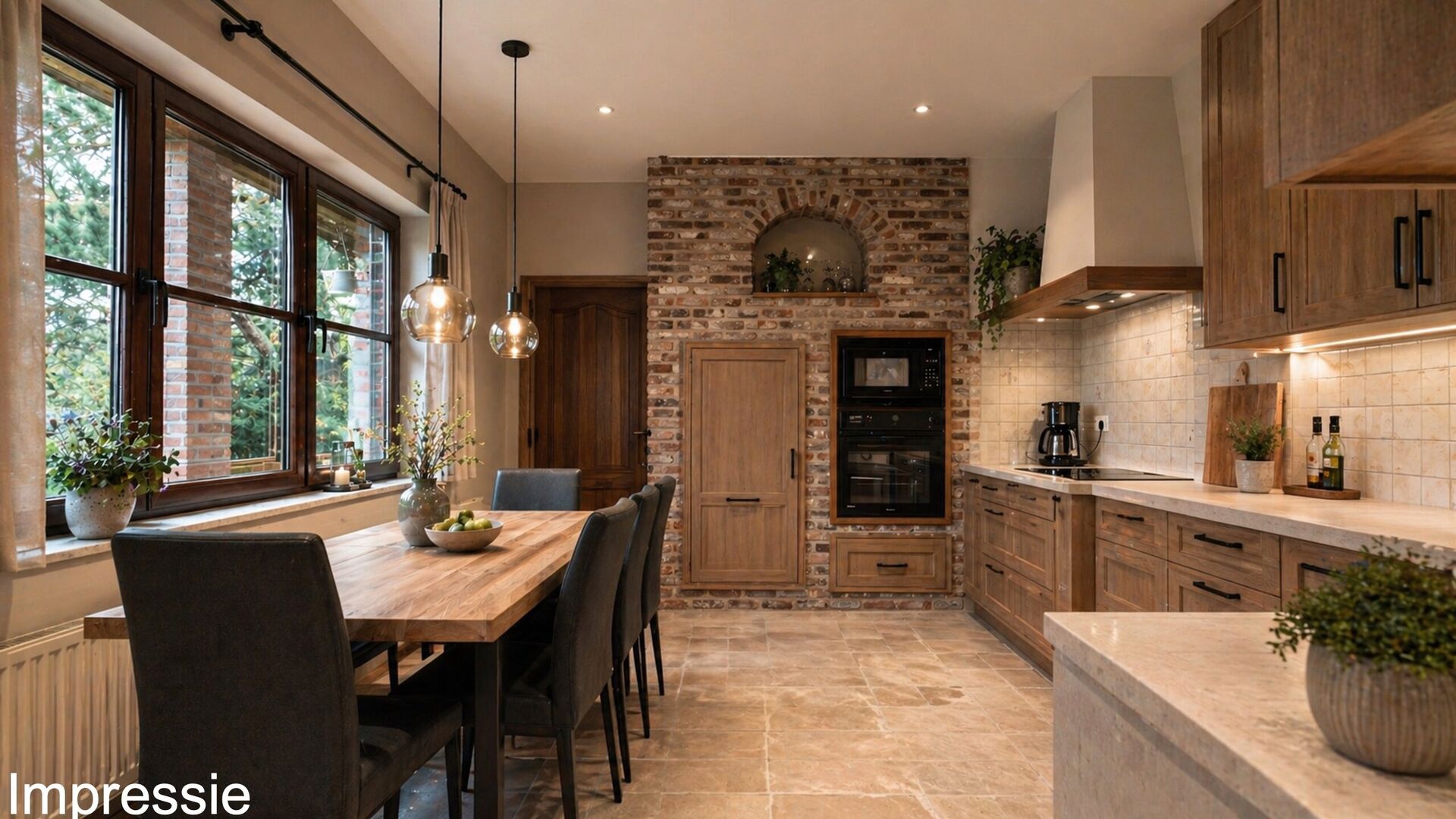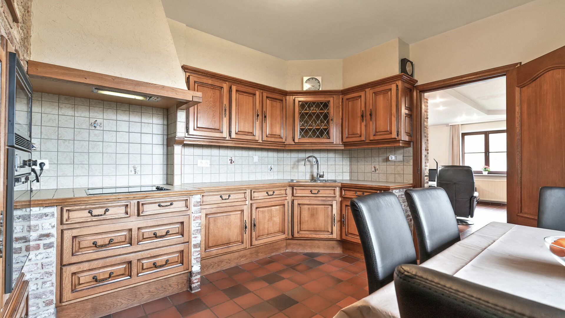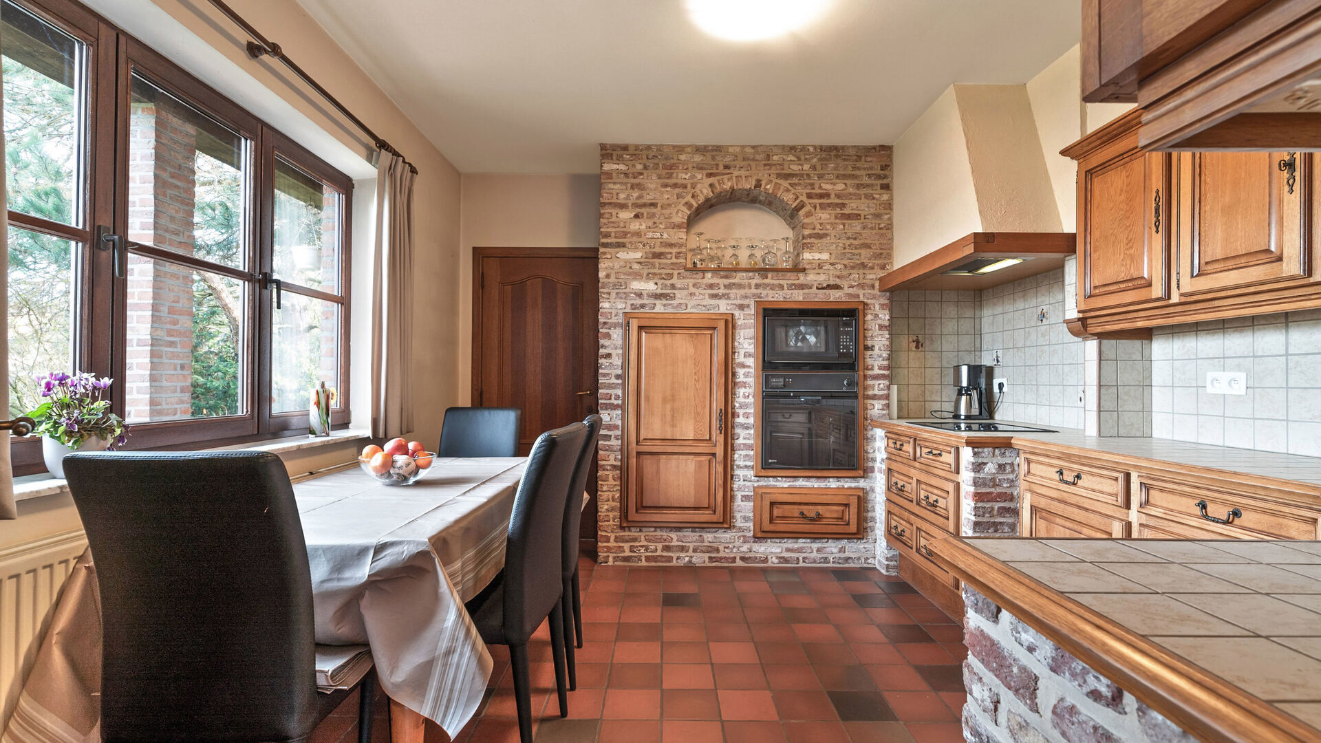 • Aansluitend vind je de keuken met houten kasten, wandtegels en een werkblad in dezelfde tegelafwerking. De keuken is volledig uitgerust met kookplaat, dampkap, oven, microgolf, koelkast en afwasbak.