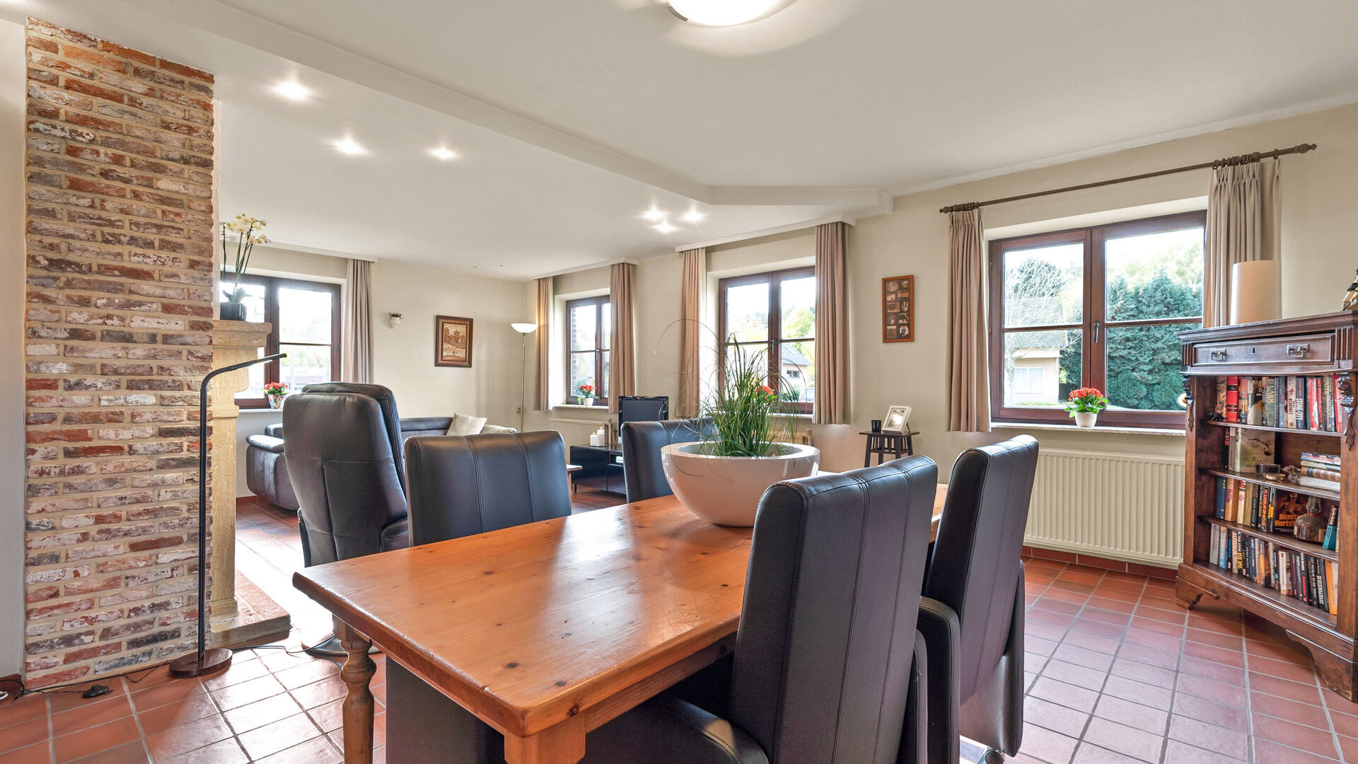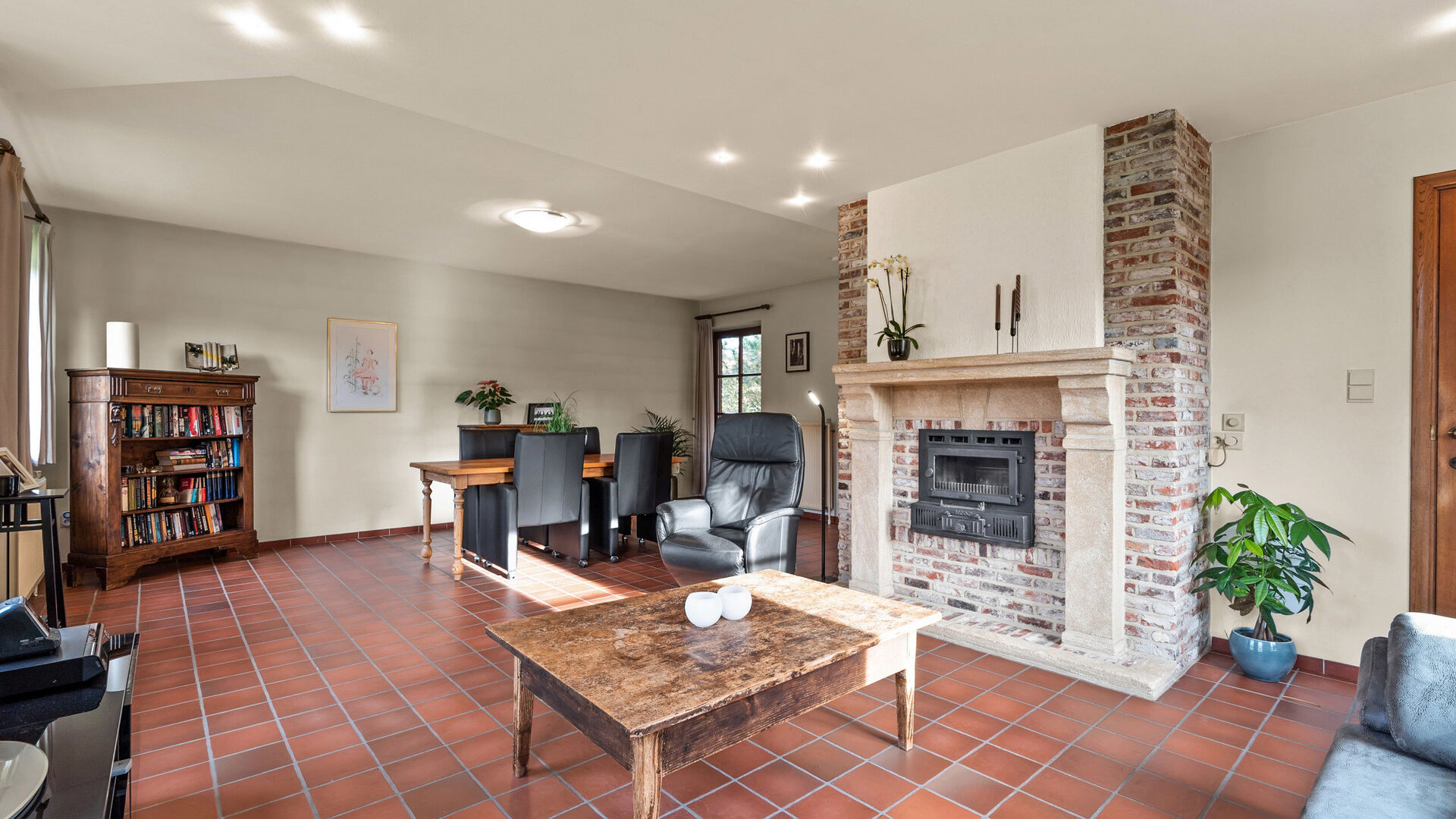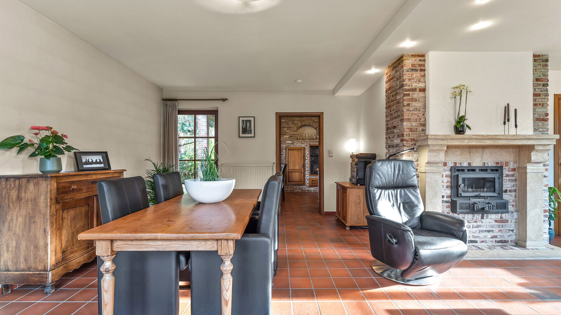 • Links leidt de hal naar de lichtrijke leefruimte met veel ramen, open haard met schouw, inbouwspots, verwarming en een grote raampartij tot op de vloer.