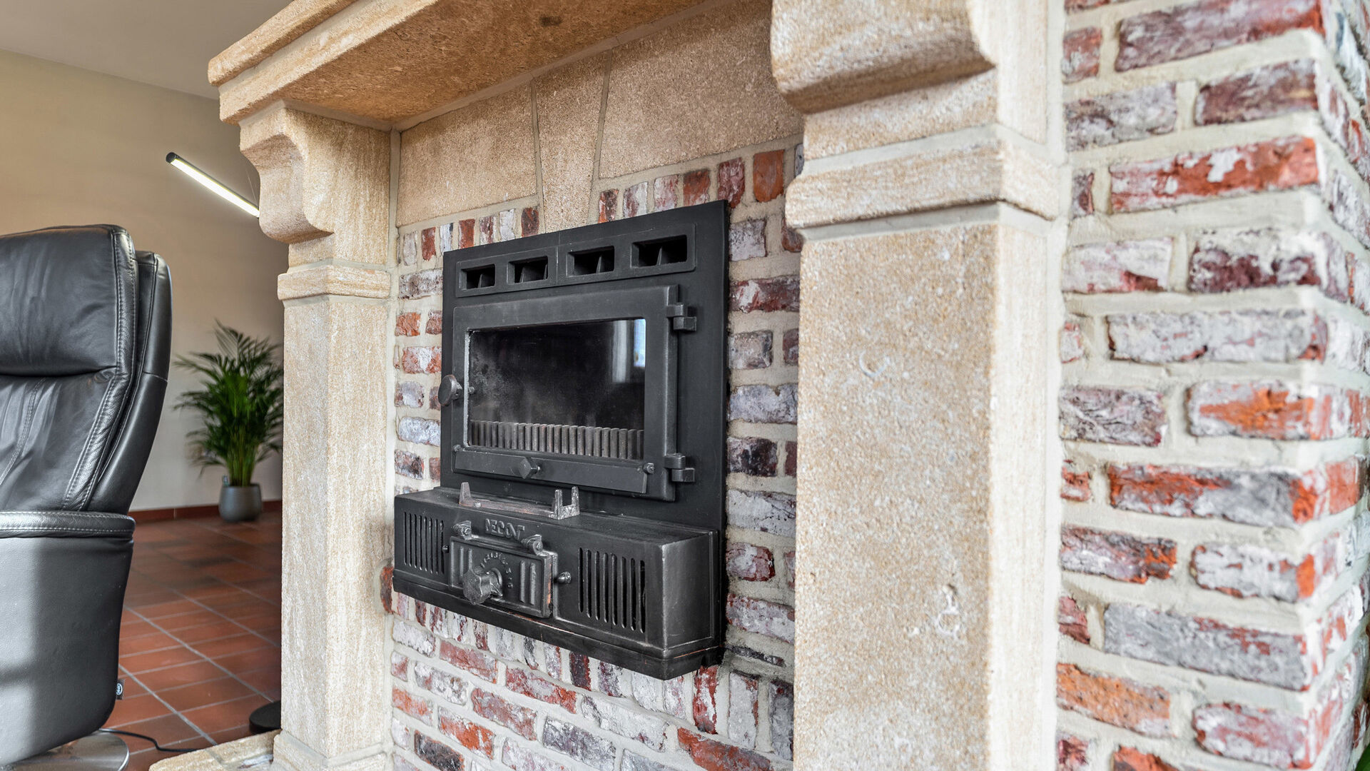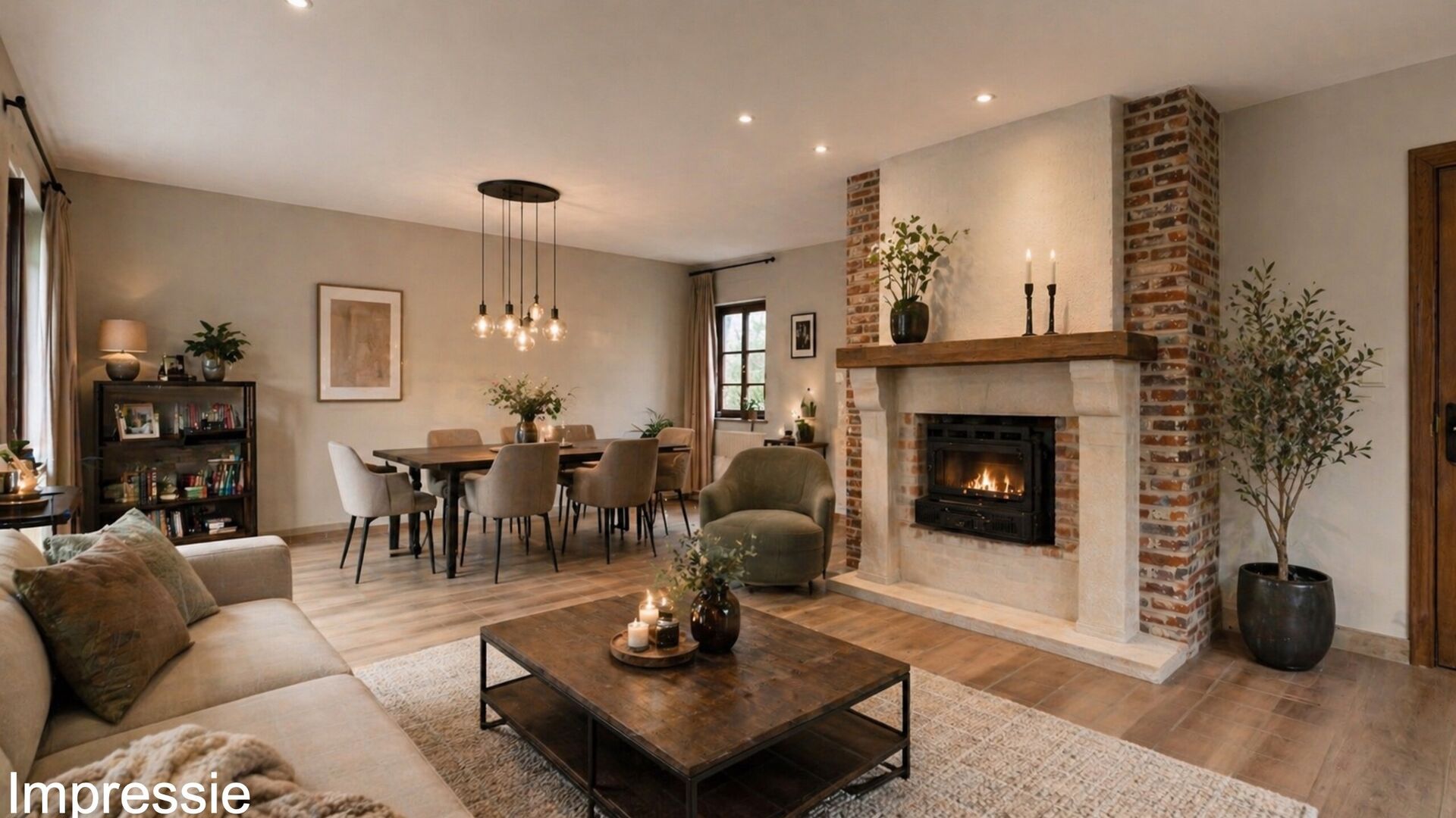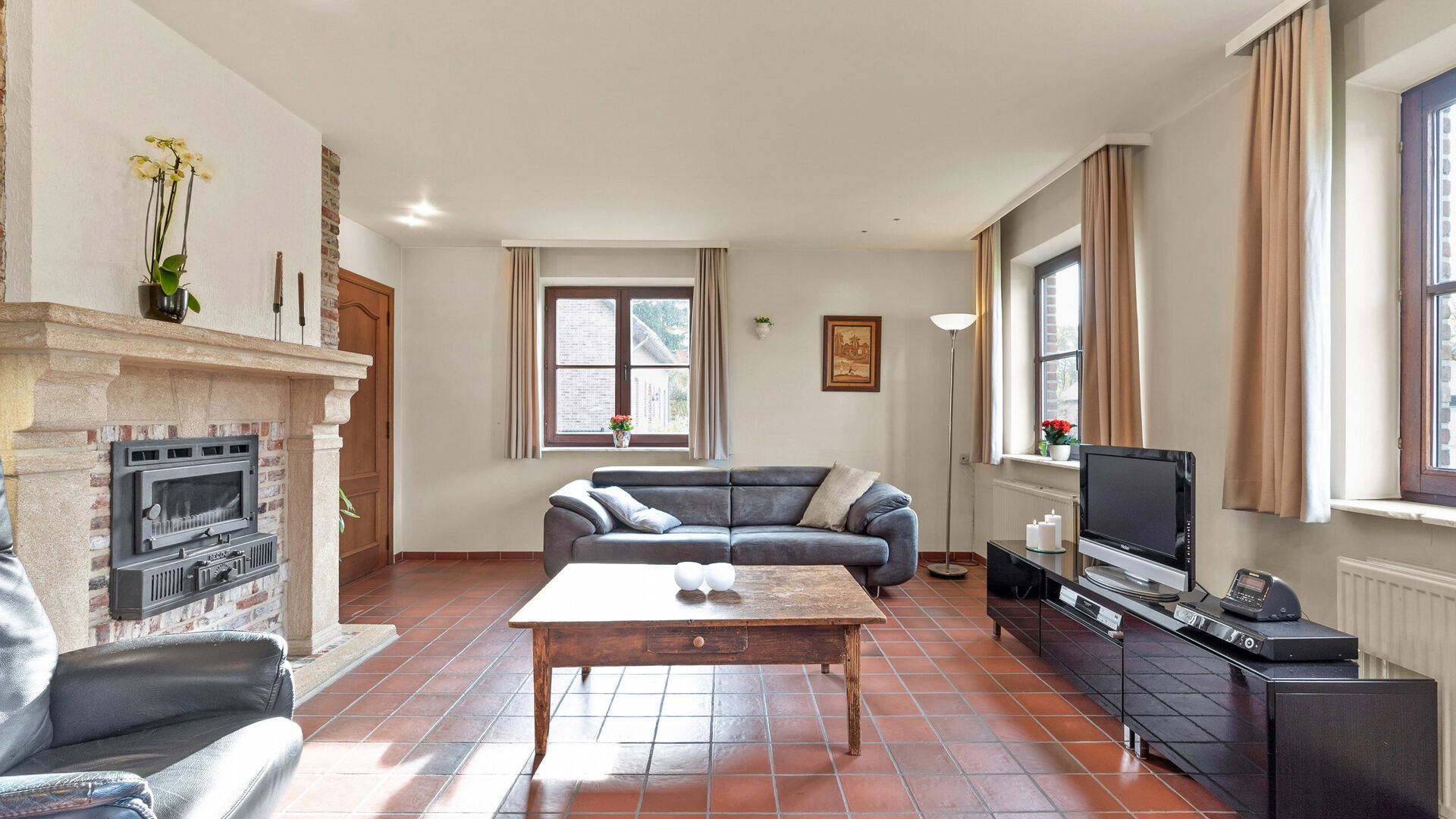• Links leidt de hal naar de lichtrijke leefruimte met veel ramen, open haard met schouw, inbouwspots, verwarming en een grote raampartij tot op de vloer.