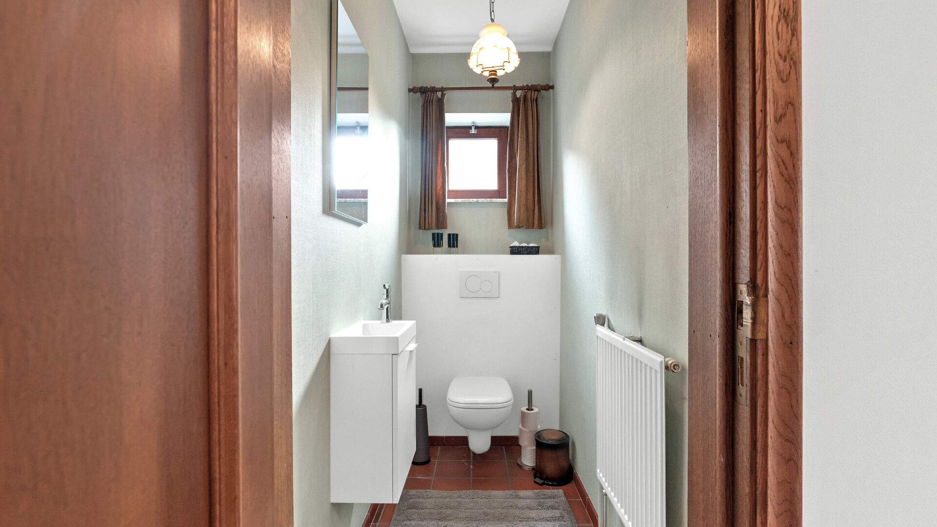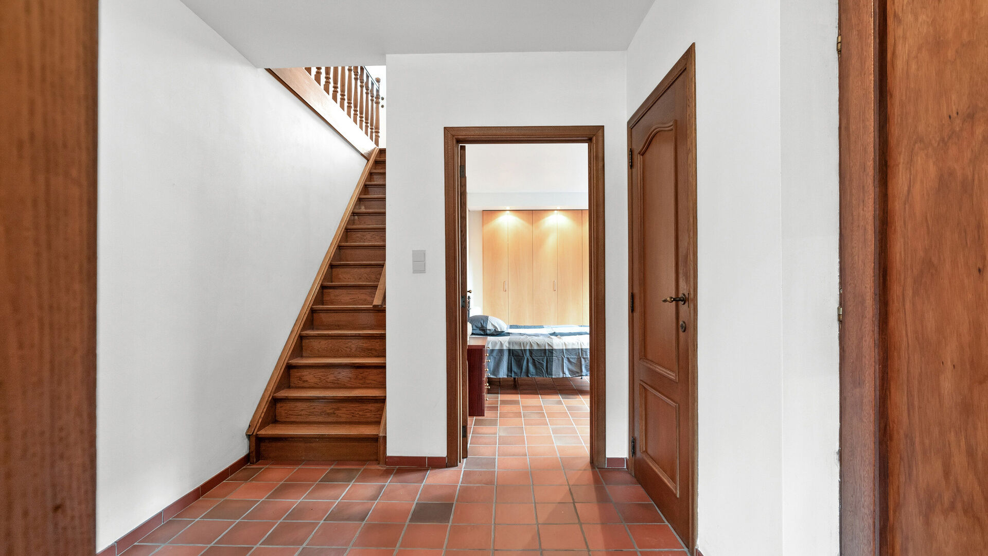 Bij binnenkomst kom je in een ruime inkomhal met een bruine tegelvloer die doorloopt over de volledige benedenverdieping én de nachthal boven. In de inkomhal is een apart gastentoilet voorzien.