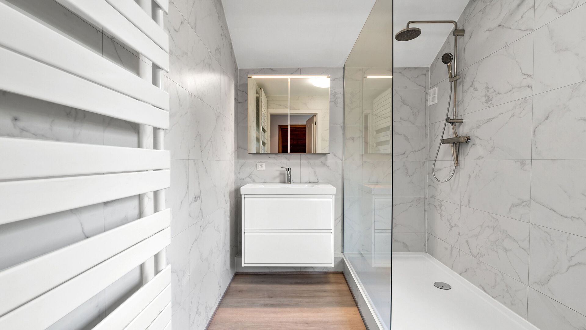 De badkamer werd recent vernieuwd en is stijlvol afgewerkt met witte marmerlook wandtegels, lichte laminaatvloer, sierradiator, hangtoilet, grote inloopdouche met regendouche, lavabo en spiegelkast.
