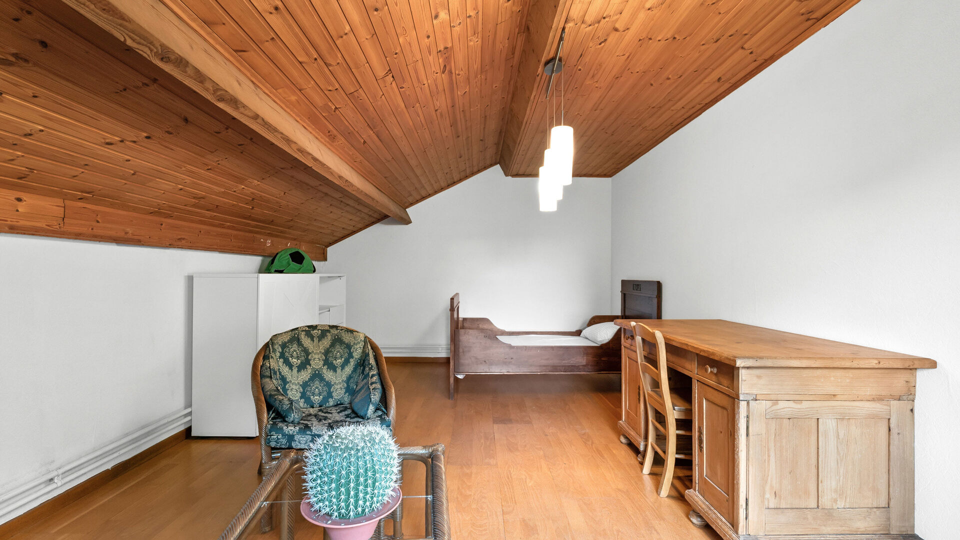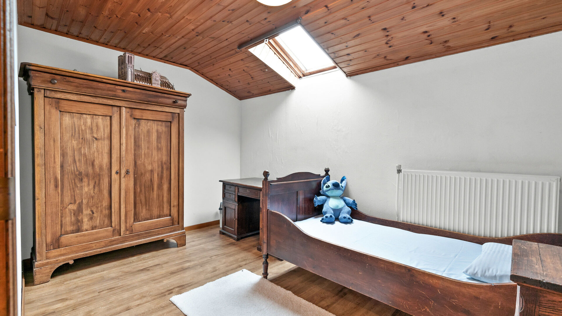 • Slaapkamer 3: vinylvloer, houten plafond, verwarming en dakraam.