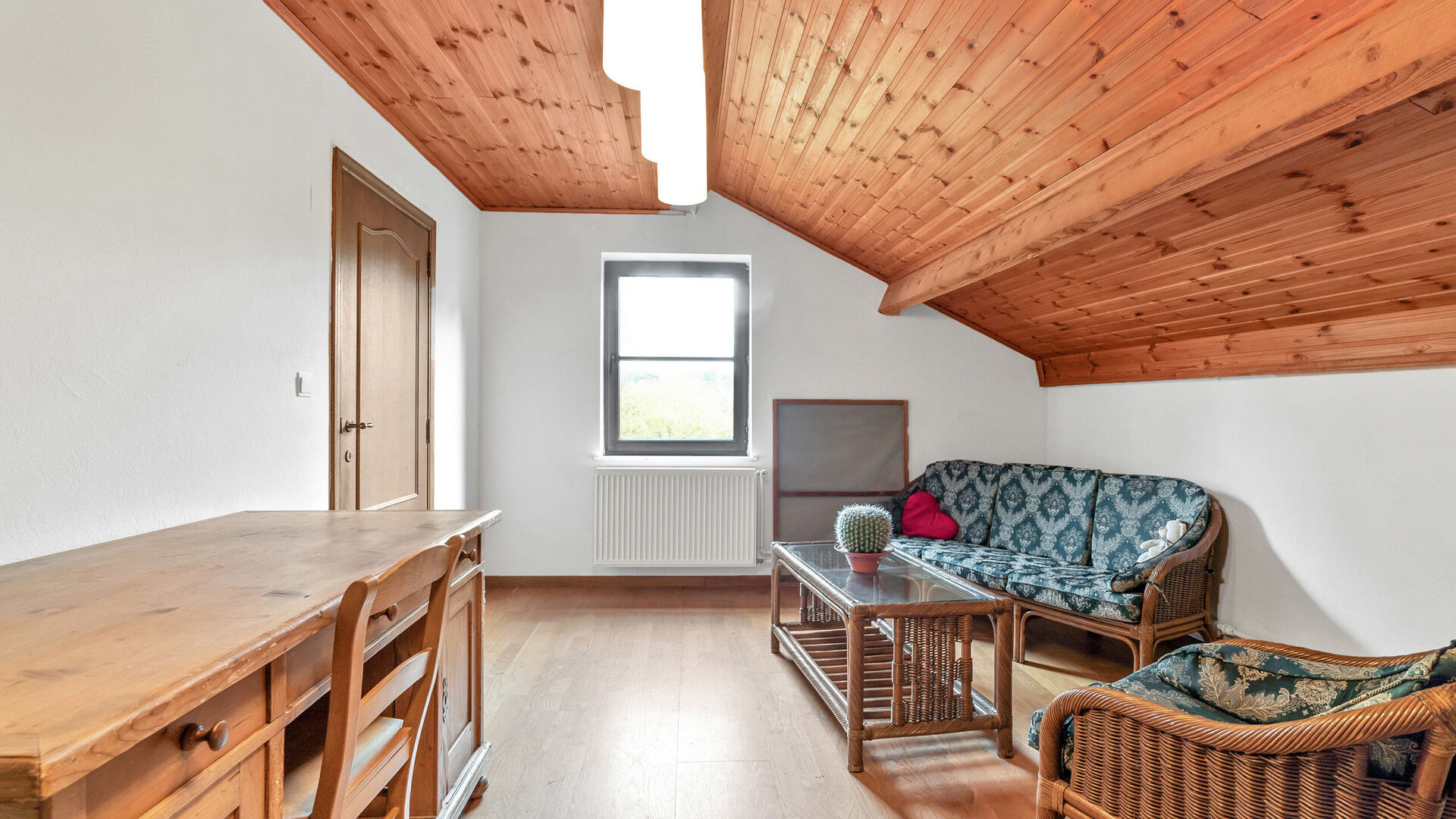 • Slaapkamer 2: laminaatvloer, houten plafond, verwarming en raam.