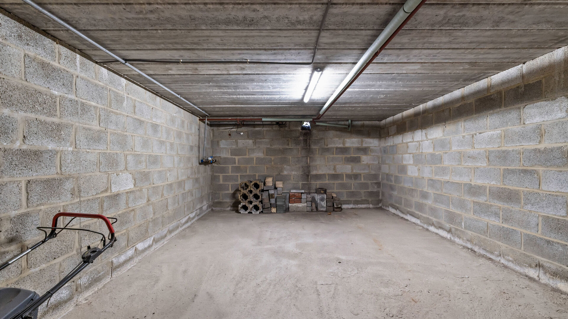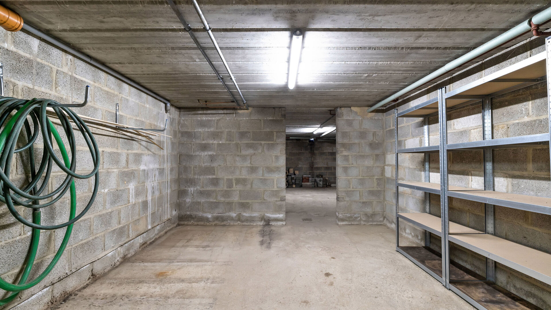 De kelder is opgedeeld in vijf aparte ruimtes, waarvan één dienstdoet als garage (voorzien van vloerbetegeling) en de overige als opbergruimtes. Hier vind je ook de meterkasten en watermeter terug.